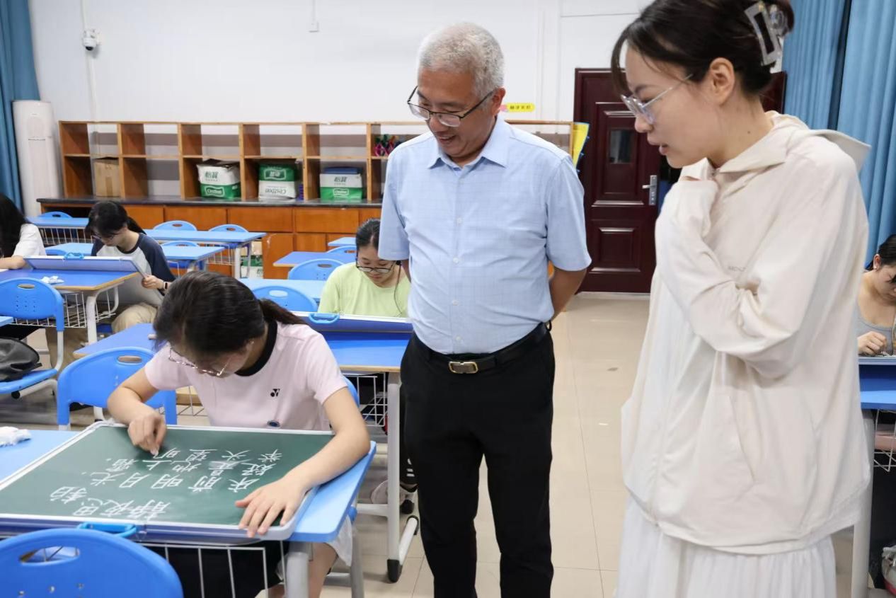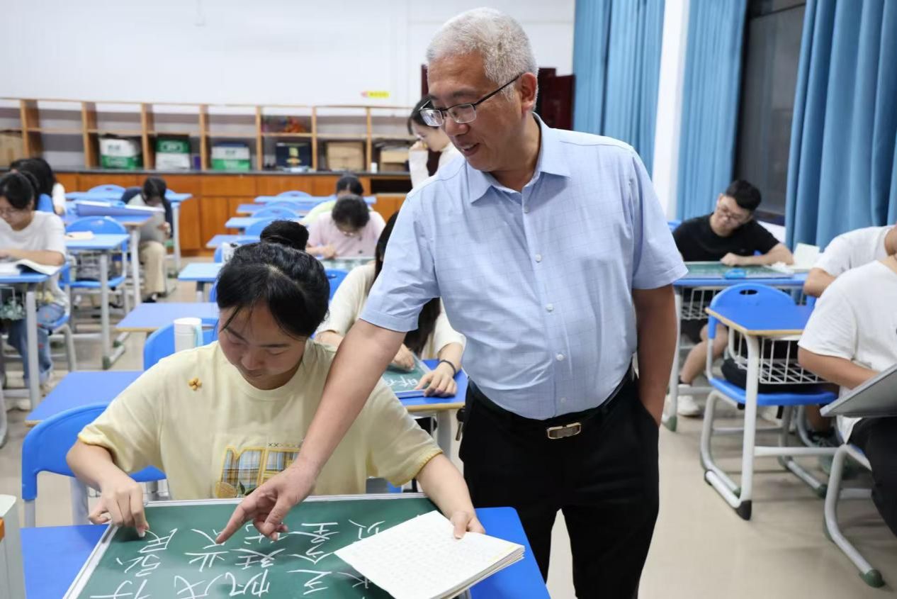 成赛军与孟欢围绕硬笔字、粉笔字、毛笔字和普通话四项教学基本功展开精准指导。成赛军则在观察同学们的普通话和粉笔字训练表现后,给出指导性意见,并采用“理论+实践”教学法,结合丰富教学经验,深度剖析书写能力与普通话水平在教学实践中的重要意义,为学生们明确努力方向。孟欢从规范握笔姿势入手,细致拆解笔画结构要点,以专业且易懂的方式为同学们答疑解惑。现场学习氛围浓厚,同学们全神贯注地聆听讲解,纷纷表示将强化师范生核心技能训练,以更饱满的热情投入后续学习。