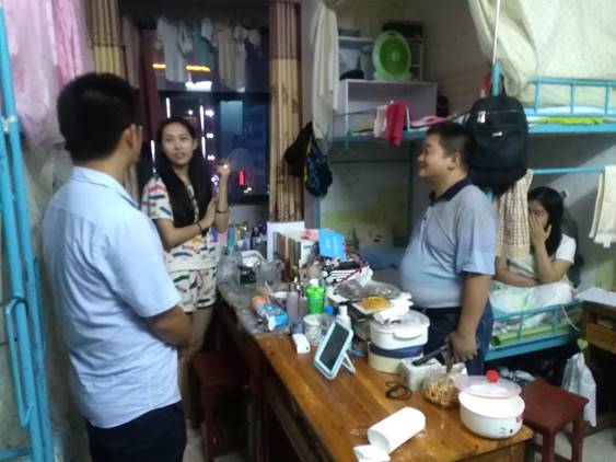 本网讯(通讯员 肖国伟)9月4日晚,在KY官网开学之际,KY官网副院长杨国辉及辅导员张得才来到女生18栋、4栋、9栋,男生阳光三栋、六栋宿舍楼进行宿舍大排查。