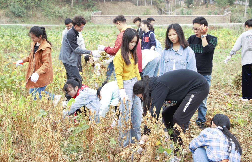 经过一个多小时的车程,全体人员来到了宁静古朴的蛇形山镇杉和村。在游训龙、张得才的引导下,所有同学向当地农民认真了解割豆子、捆豆子、搬豆子的相关程序,学习有关农具的使用方法。随后,老师和同学一起深入农村,走进田野,发扬志愿服务精神,正式开展志愿活动。游训龙书记、张得才老师带领同学们分工行动。有些同学缺少农耕经验和农村生活经历,在老师的鼓励下,这些同学也大胆地走进田园,开展劳动。许多女同学也乐在其中,泥土沾在裤脚,喜悦漾在心海。一份耕耘,一份收获。活动中,老师与同学们精诚团结,共同劳动,顺利高效地帮助当地农民完成了豆子的秋收。