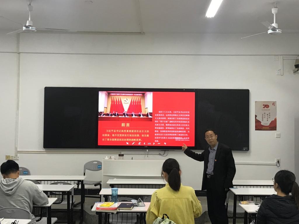 10月22日晚,KY官网党总支书记游训龙教授于致远楼603教室为青马工程培训班作了题为“习近平全面推进依法治国战略的哲学思维方式”专题课,青马工程培训班全体学生到场学习。