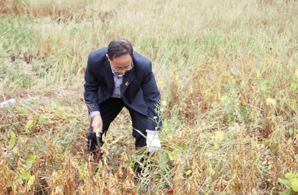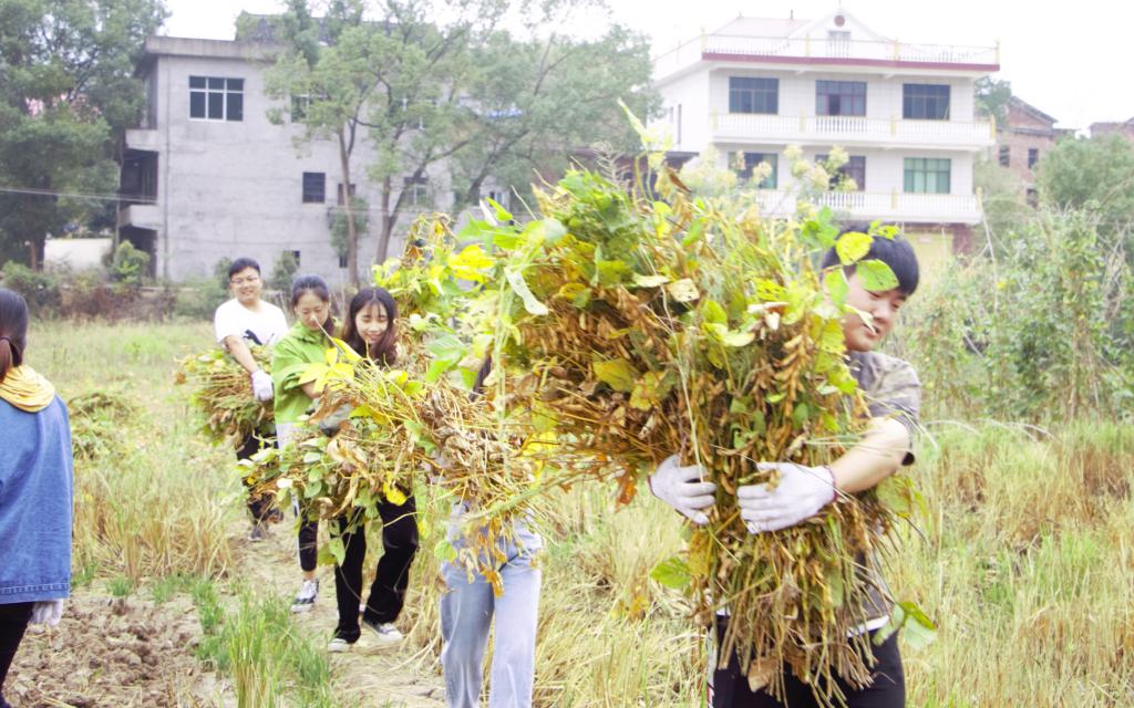 经过一个多小时的车程,全体人员来到了宁静古朴的蛇形山镇杉和村。在游训龙书记、张得才老师的引导下,所有同学向当地农民认真了解割豆子、捆豆子、搬豆子的相关程序,学习有关农具的使用方法。随后,老师和同学一起深入农村,走进田野,发扬志愿服务精神,正式开展志愿活动。游训龙、张得才带领同学们分工行动。有些同学缺少农耕经验和农村生活经历,在老师的鼓励下,这些同学也大胆地走进田园,开展劳动。许多女同学也乐在其中,泥土沾在裤脚,喜悦漾在心海。一份耕耘,一份收获。活动中,老师与同学们精诚团结,共同劳动,顺利高效地帮助当地农民完成了豆子的秋收。