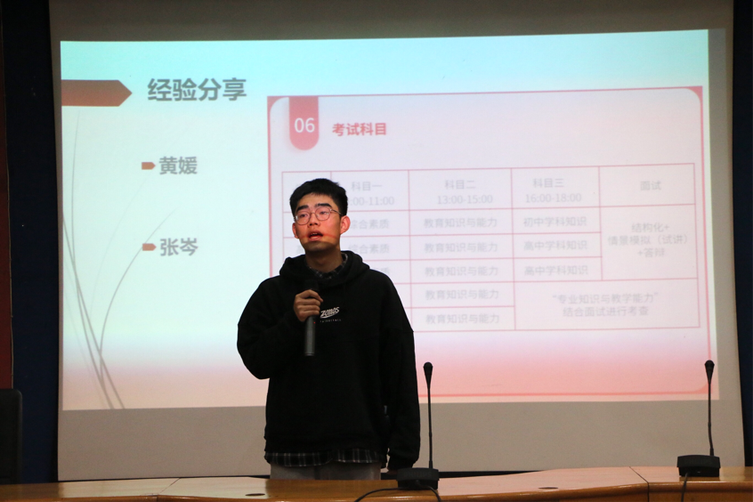 分享会上,18级黄媛、张岑具体讲述教资笔试与面试的相关内容,并与在座同学分享面试小技巧。他们结合自身的考试经历,提出一些注意事项和具体细节。15级李婉溶学姐以音频的形式向大家分享了自己在师范生技能竞赛上积累的经验。
