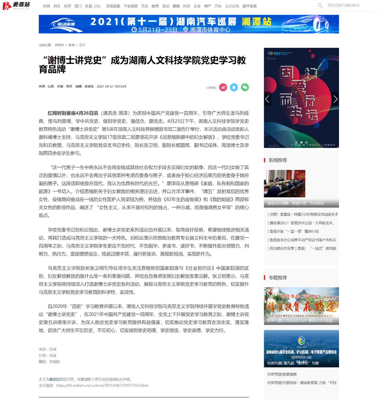 红网报道指出在建党一百周年之际和百年未有之大变局中,“谢博士讲党史”成为一条加强党史学习的有效途径,它将成为KY开元集团官网入口马克思主义学院党史学习教育品牌。