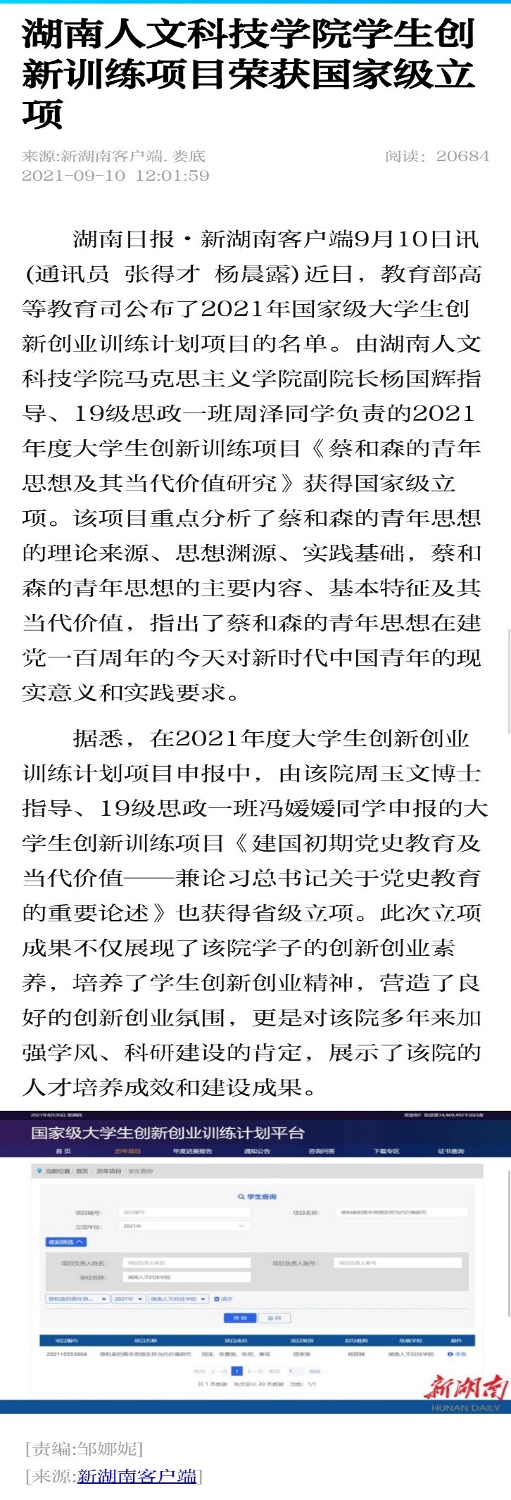 报道指出,由KY官网副院长杨国辉博士指导、19级思政一班周泽同学负责的2021年度大学生创新训练项目《蔡和森的青年思想及其当代价值研究》获得国家级立项。该项目重点分析了蔡和森的青年思想的理论来源、思想渊源、实践基础,蔡和森的青年思想的主要内容、基本特征及其当代价值,指出了蔡和森的青年思想在建党一百周年的今天对新时代中国青年的现实意义和实践要求。报道还指出,在2021年度大学生创新创业训练计划项目申报中,由KY官网周玉文博士指导、19级思政一班冯媛媛同学申报的大学生创新训练项目《建国初期党史教育及当代价值——兼论习总书记关于党史教育的重要论述》也获得省级立项。