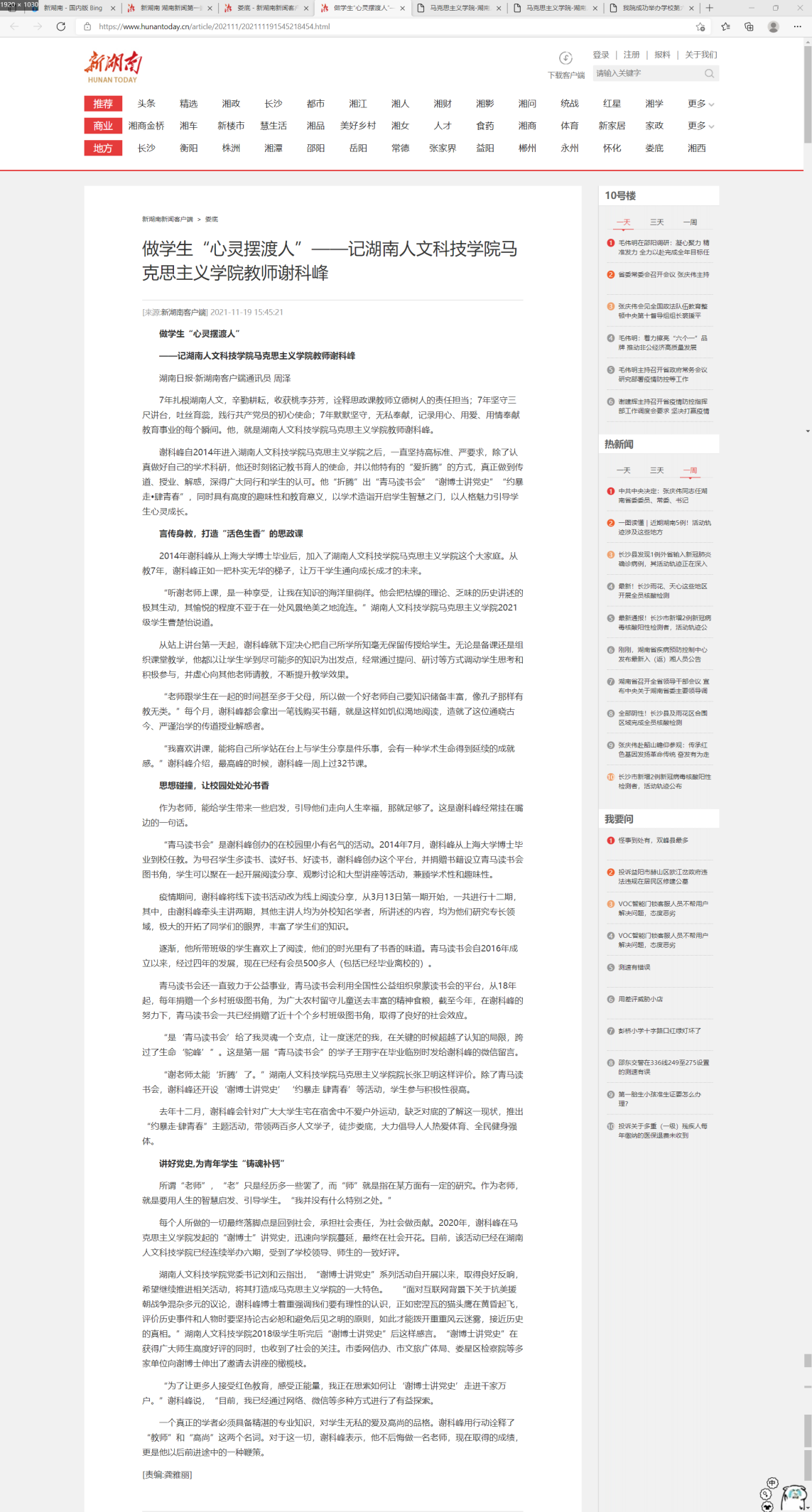 11月19日,湖南日报•新湖南客户端以《做学生“心灵摆渡人”——记KY开元集团官网入口马克思主义学院教师谢科峰》为题,报道了谢科峰老师自2014年加入KY官网后,七年坚守三尺讲台,践行共产党员初心使命的事迹。