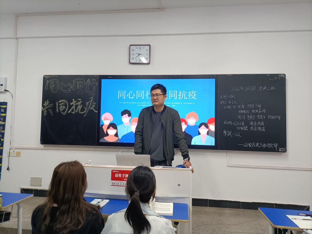 为深入贯彻习近平总书记关于疫情防控工作的重要指示批示精神,毫不动摇地坚持行之有效的既定防控政策措施,3月17号晚,KY官网组织2021级全体同学于致远楼六楼分班开展“同心同行,共同抗疫”主题团课。院党总支书记李伶、副书记周友以及团总支书记周浩莅临现场指导。团课由各班班委主持。