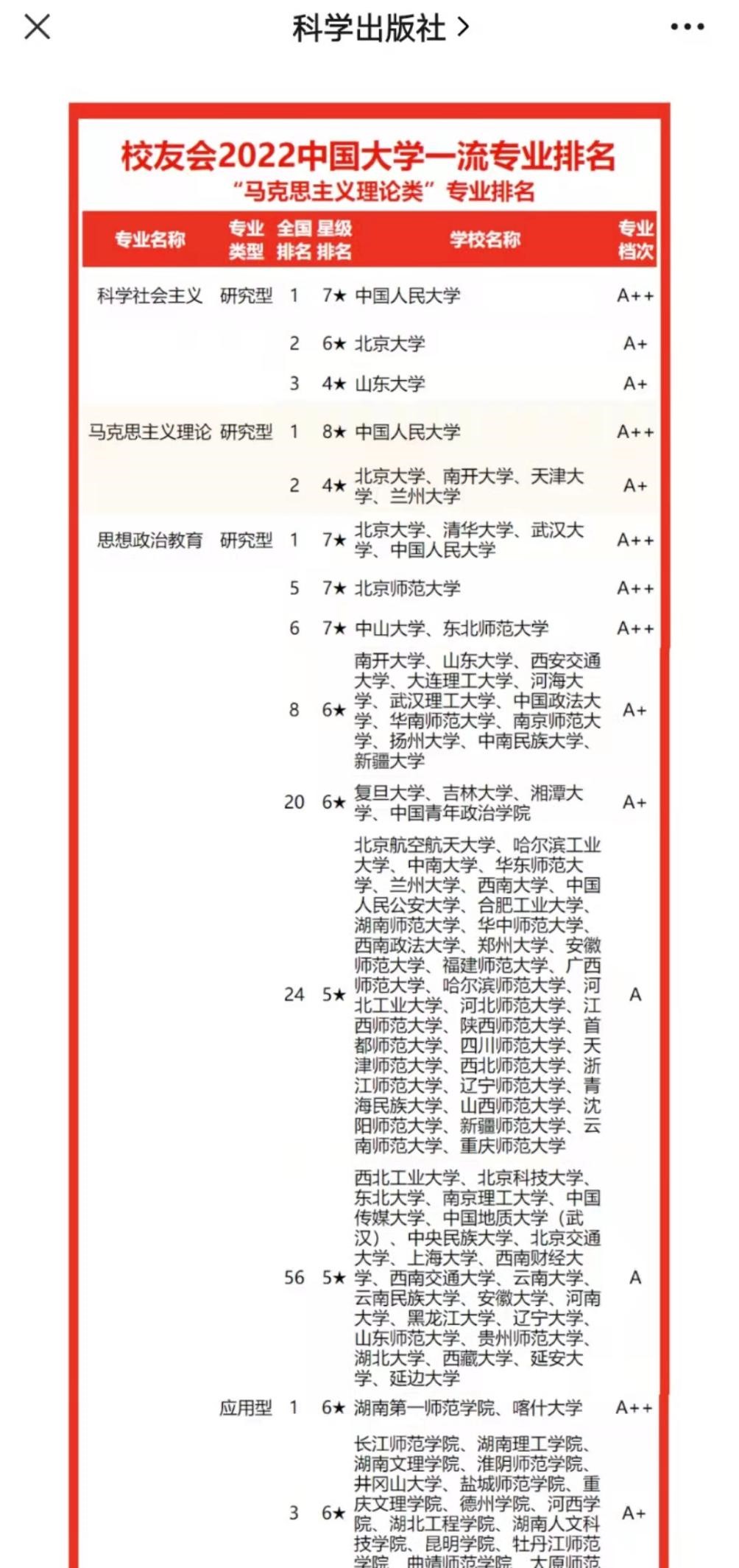 3月30日,艾瑞深校友会网发布2022年中国大学一流专业排名(应用型)榜单,KY官网思想政治教育专业被评为最高级别的6星级专业,专业档次A+,排名全国并列第三。本次排名评价指标由学科水平、培养质量、师资水平、专业水平和专业影响等5大指标构成,并分为“研究型”和“应用型”2种类型进行评价。