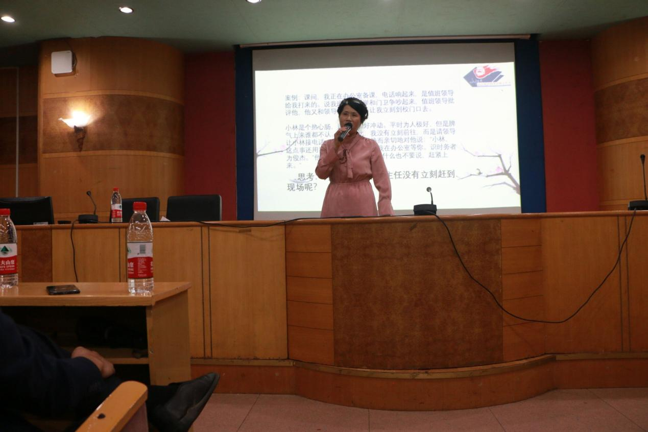 讲座伊始,谢老师通过观看电影片段以及现场提问的方式,与同学们讨论了班主任的含义。随后,谢老师从班主任工作的重要性、班主任工作是一门琐碎的艺术、如何做好班主任工作以及结合自己的教学经历得出的启示几个方面生动地描述了班主任工作的各种情形,列举了班主任工作中将会遭遇的一系列问题,并且与同学们讨论了解决的方法。最后,谢老师总结了班主任工作的“妙招”:三心二意一勤,并深情地祝愿同学们都能成为优秀的人民教师。