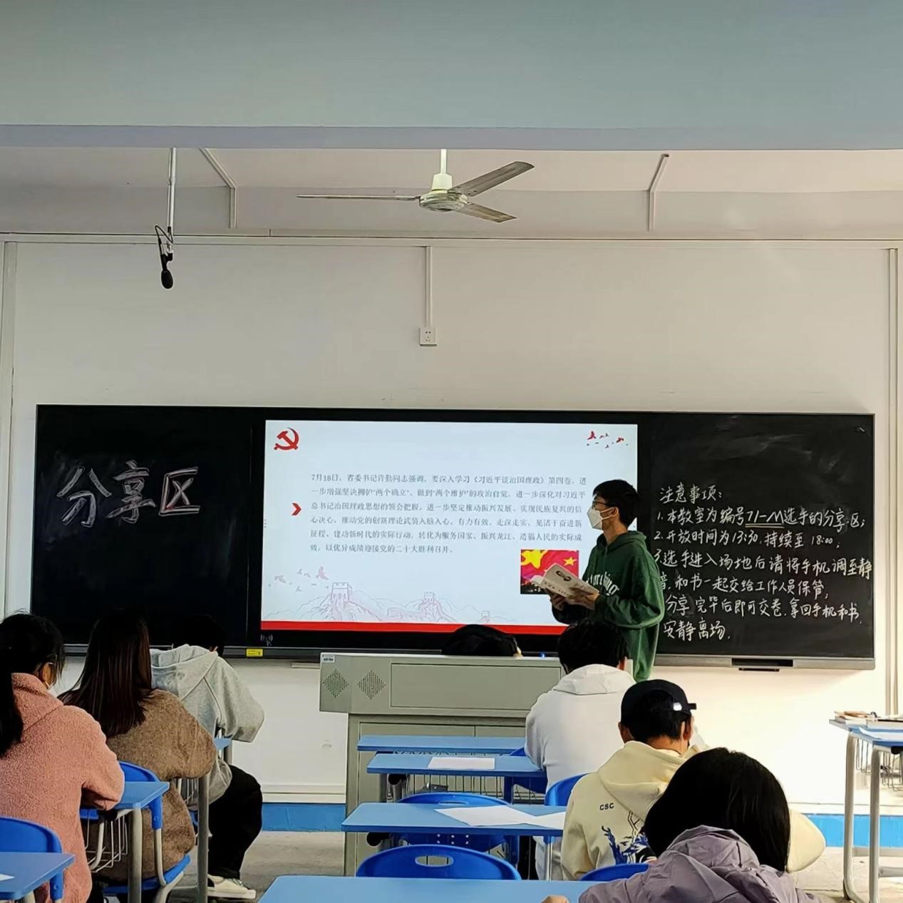 上午10点,来自各院系近百名选手分别于阅读区若谷楼208、209、301教室开始了长达6小时的沉浸阅读,并于阅读完毕后至分享区进行阅读分享。《习近平谈治国理政》(第四卷)是马克思主义中国化最新成果的集中体现,是深入学习贯彻习近平新时代中国特色社会主义思想的权威著作和最新教材,本次比赛选用此书的目的是号召青年大学生以新时代党的创新理论武装头脑,将个人的理想与国家的前途命运紧密联系起来。读原著、学原文、悟原理、知原义,通过对本书的集中阅读,参赛者深刻领会了习近平新时代中国特色社会主义思想的丰富内涵和精髓要义,并结合历史与自身经历围绕各个专题展开阅读分享。多数参赛者围绕“新飞跃”这一关键问题,以科学把握“两个结合”、紧扣“三大时代课题”、厘清“十个明确”的“不变”与“变”为切入点进行分享;对于“以保障和改善民生为重点加强社会建设”这一主题,有参赛者说道,一个现代化的社会,应该既充满活力又拥有良好秩序,我们每个人都是社会治理的参与者。