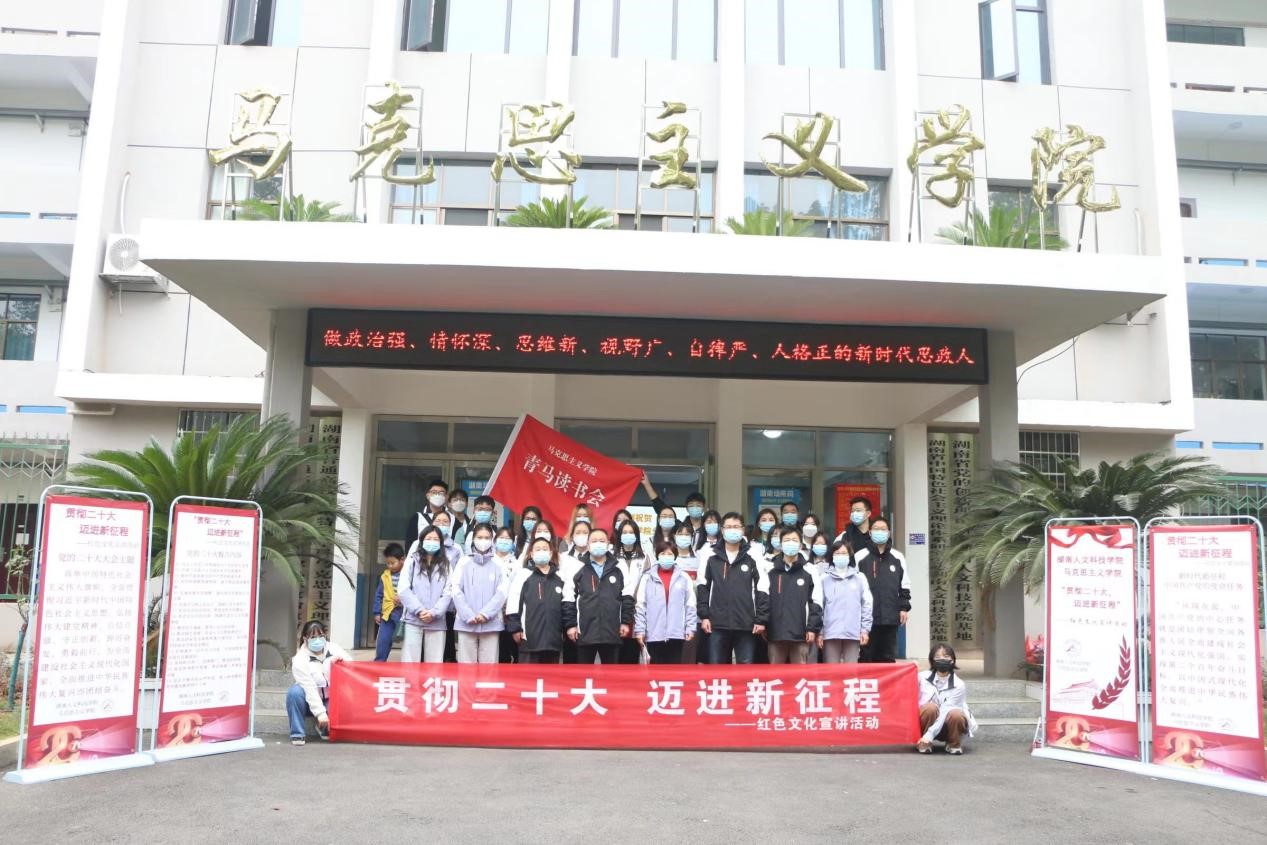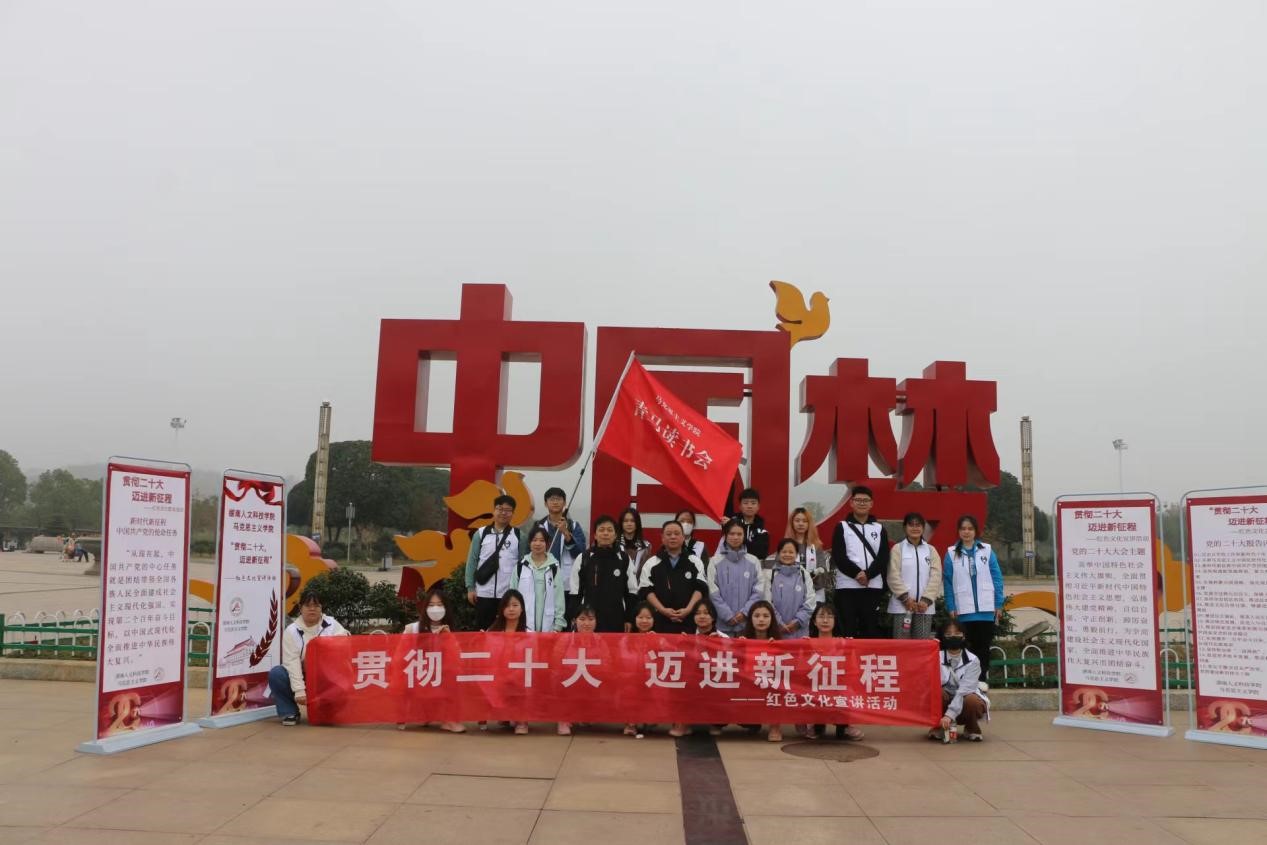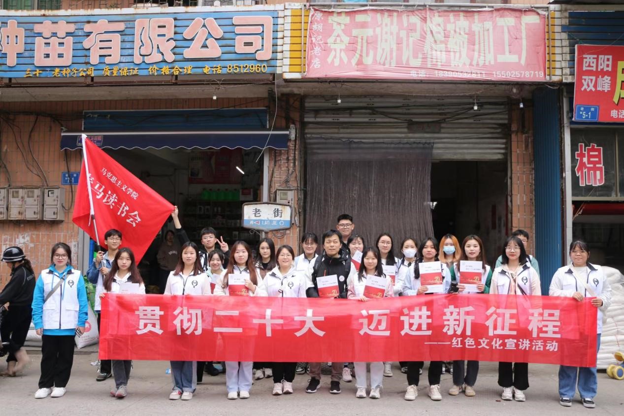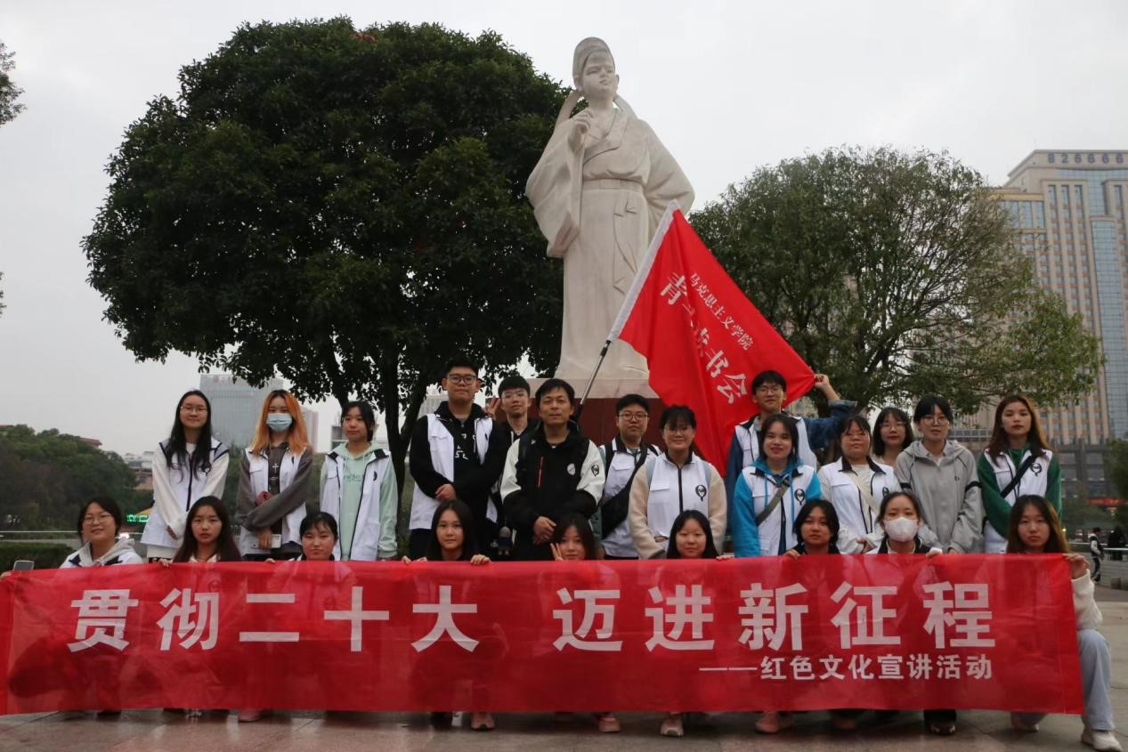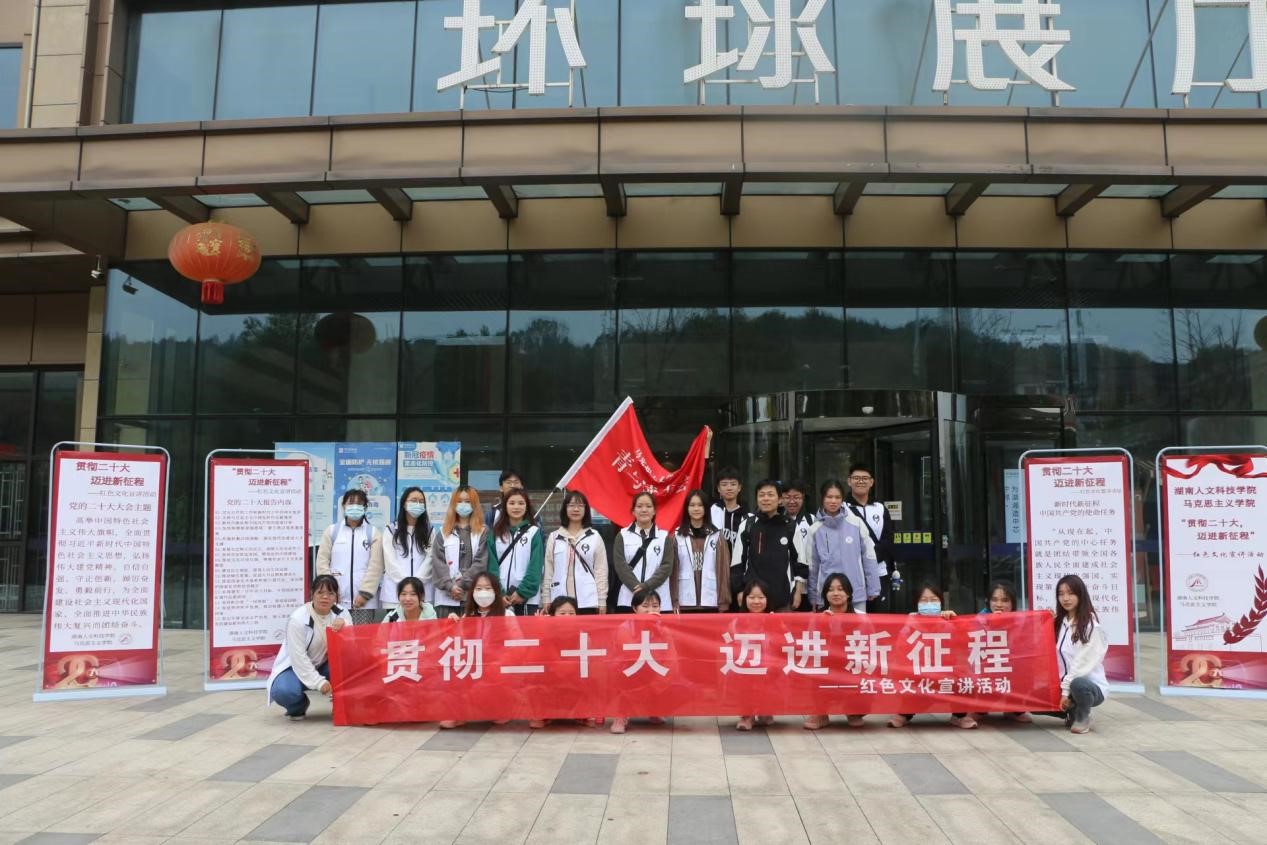 活动伊始,党总支书记李伶表示,深入宣传中国共产党精神谱系,做好高等教育中的红色文化宣讲工作,对于赓续红色血脉、传承红色基因、发扬红色文化来说意义重大。院长张卫明指出,“培根铸魂,启智润心”,这是一堂行走的思政课,青年教师带领志愿者一起学习贯彻党的二十大报告精神,了解祖国日新月异的新面貌新成就,祝愿红色宣讲队伍能在娄星区这一广阔的平台上上好这一课。志愿者们在谢科峰博士的带领下围绕娄星区开展流动式红色宣讲,途经吾悦广场、市政府、孙水公园、国土局、珠山公园、职业技术学院、二中、区政府、新华书店、万豪城市广场等主要地点传承红色基因、赓续精神血脉。宣讲队员用生动形象的语言围绕党的二十大报告进行分析讲解,紧密联系群众身边事,与群众积极互动,充分营造学习宣传党的二十大精神的浓厚氛围,让党的二十大精神走进群众心里。宣讲结束后,志愿者们纷纷表示,在实践中学习贯彻党的二十大精神,切实用党的二十大精神武装头脑、指导实践,能进一步认识到当代中国青年生逢其时,施展才干的舞台无比广阔,实现梦想的前景无比光明。