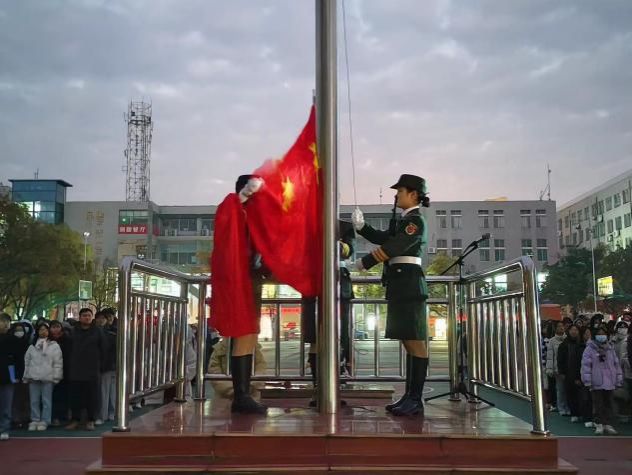 在同学们的注视下,国护队昂首阔步,动作整齐划一。随着国歌奏起,五星红旗缓缓上升,迎风飘扬,拉开了升旗仪式的序幕。