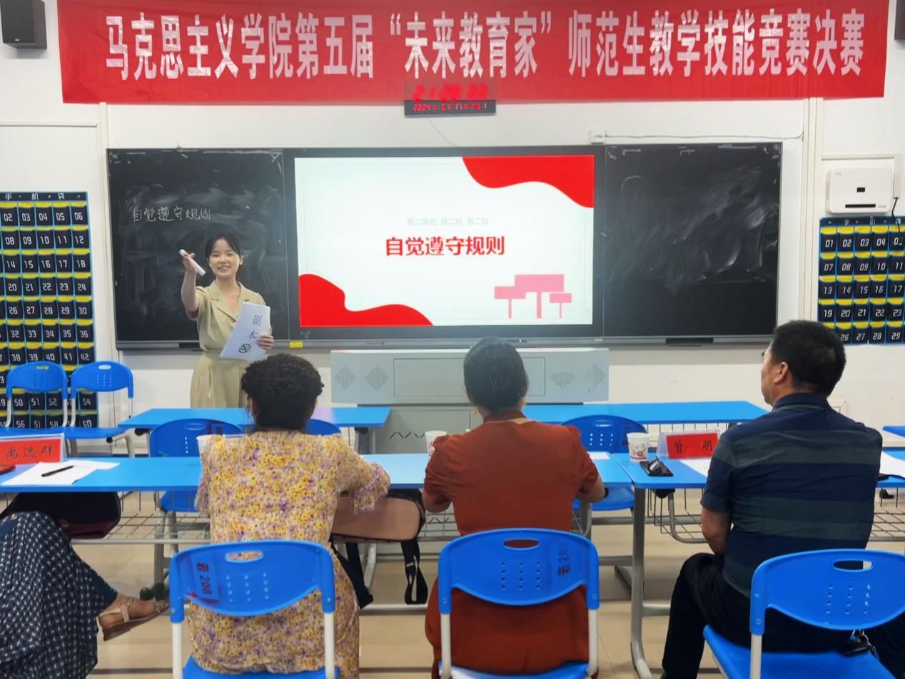 本次决赛从教学设计、课件制作、片段教学三个方面进行考察,参赛选手需现场完成1个课时的教学设计,再并学设计内容中选取一段制作教学课件,最后结合学情与教学重难点,选取对应知识点进行片段教学展示。比赛伊始,选手们从抽取的《我与社会》、《网络生活新空间》、《维护宪法权威》等课题出发,立足于中学思政课新课标教学要求,通过格具风格的教学设计,向评委呈现了一堂堂引人入胜的中学思政课。随后,评委老师们对10位参赛选手进行了现场点评,并在课件制作、课堂互动、教学设计等方面给出了专业性、前瞻性的指导。最终,KY官网23级2班张满获一等奖,21级2班龚丽希、21级2班王可儿获二等奖,21级2班王芷娴、22级2班陈翔、23级1班李思怡获三等奖。