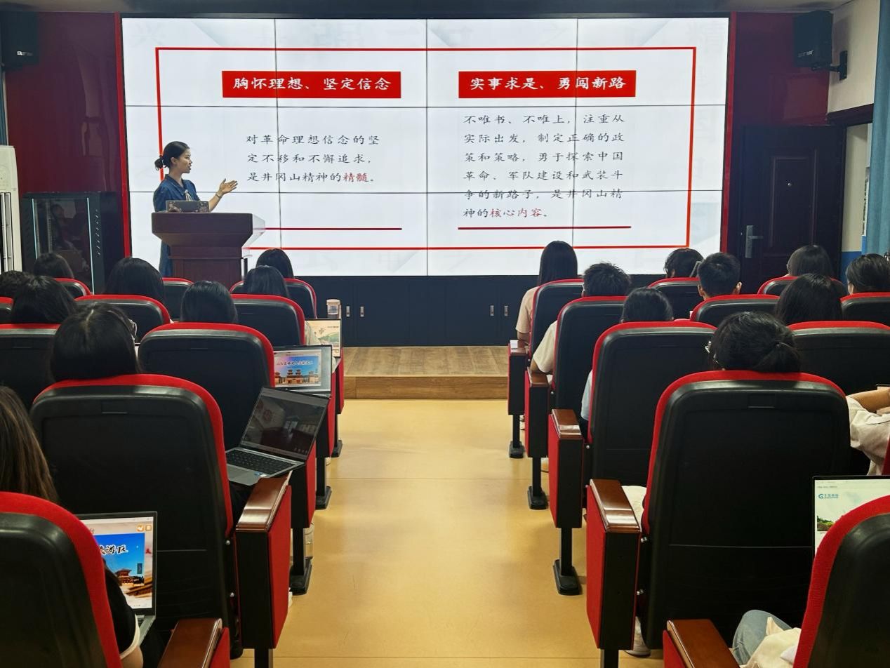 课上,李婉溶首先以井冈山精神产生的背景引出深刻话题,并从多方面阐述井冈山精神“胸怀理想、坚定信念”“实事求是、勇闯新路”等基本内涵,带领同学们切身感受革命时期中国共产党人在井冈山斗争中的艰难过程。随后,李婉溶借助VR实训设备引导同学生们跨越时空,线上参观井冈山革命根据地、井冈山碑林、毛泽东旧居等红色教育基地。最后,李婉溶在总结每小组同学代表的发言中,向大家教授了井冈山精神的现实意义。她表示井冈山精神作为中国共产党在革命斗争的艰苦岁月中形成的伟大精神和马克思主义中国化的理论结晶,走出了符合中国国情的革命道路,这对于当代大学生坚定理想信念、弘扬中国精神具有重要的指导意义。同时,希望同学们脚踏实地,志存高远,积极弘扬与传承井冈山精神,自觉做共产主义远大理想的坚定信仰者和忠实实践者。