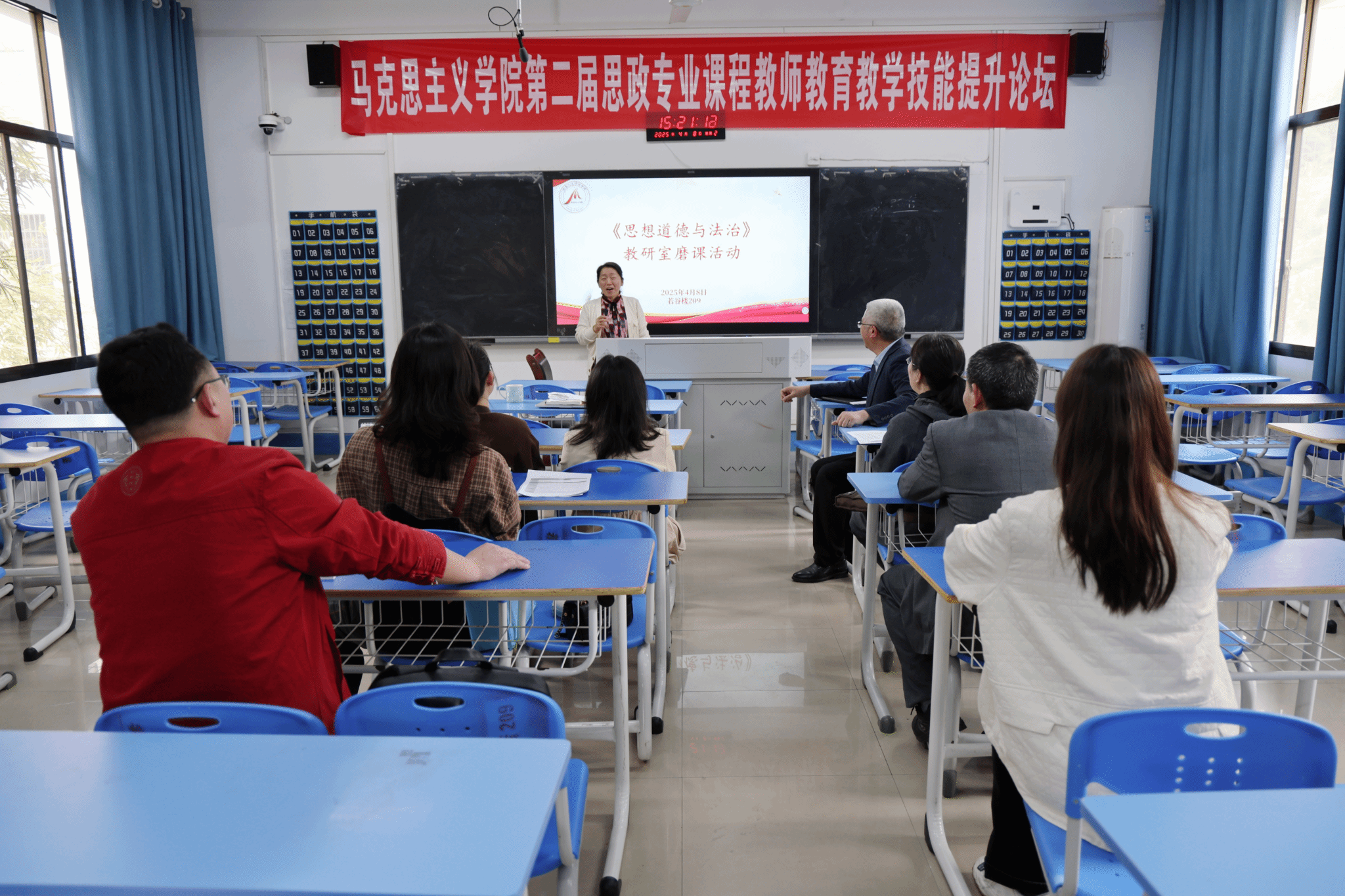 活动中,李婉溶、张娟、钟燕等老师对“维护宪法权威”“社会主义法律的特征和运行”“投身崇德向善的道德实践”三节内容分别进行说课展示。在交流讨论环节,教师们针对磨课过程中出现的教学重难点把握、课堂呈现形式、案例的合理使用等问题提出相关改进建议,大家既明确了自身的不足,也与其他教师共享了经验和智慧。成赛军作总结发言,他对各位教师的说课展示予以肯定,也指出磨课活动通过多层次、多维度的教学研讨,能够为持续提升教学质量提供强劲动力,希望教师们要以更良好的精神面貌迎接本科教育教学审核评估。