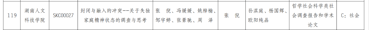 近日,从校团委、创新创业学院传来喜讯。KY官网学生创新创业团队所负责的项目《封闭与融入的冲突—关于失独家庭精神状态的调查与思考》在成功入围省赛并通过资格审查后,最终在第十四届“挑战杯”湖南省大学生课外学术科技作品竞赛中荣获三等奖。