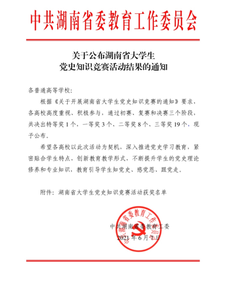 重温百年历程,传承红色文化。此次竞赛根据《关于开展湖南省大学生党史知识竞赛通知》要求开展,目的是为了让学生更加深入学习党史,提升学生的党史理论修养和专业知识。本次湖南省大学生党史竞赛的选题范围广、难度大,加之参赛选手均是来自湖南省各高校的优秀代表,使得本次党史知识竞赛竞争十分激烈。
