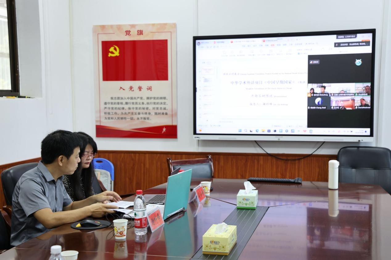 会议分为两个环节。第一环节,谢科峰博士从申报成果介绍、团队和翻译组织方案、申请人对项目各环节的组织和宣传推广组织方案等四个方面简明扼要地概括了《中国早期国家》此书的外译项目进展及翻译团队情况。在此期间,谢科峰博士就文字翻译方面提出了“精简文字和句式,使之贴合英语母语语境”的翻译要求。