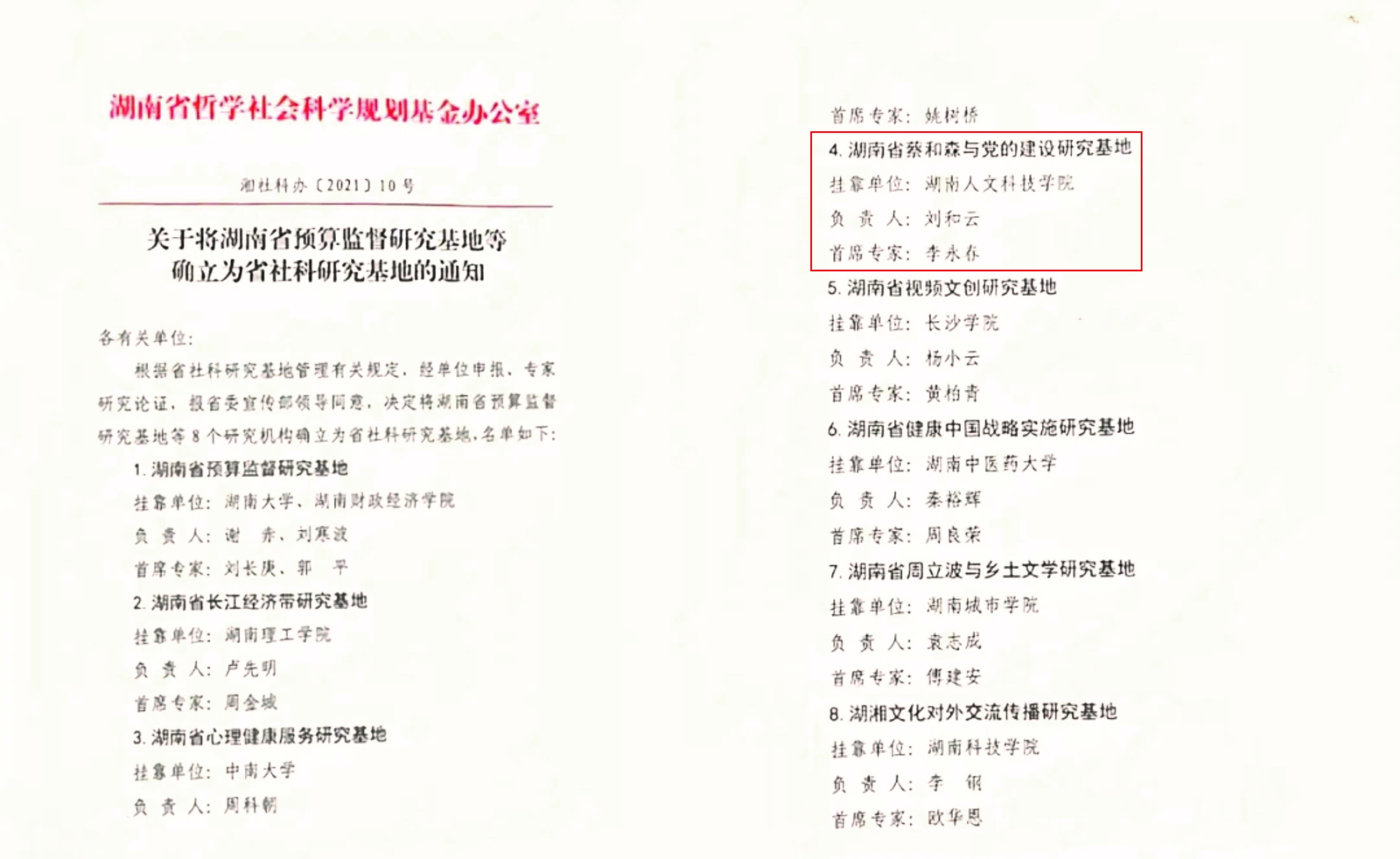 近日,湖南省哲学社会科学规划基金办公室发布《关于将湖南省预算监督研究基地等确立为省社科研究基地的通知》,根据省社科研究基地管理有关规定,经单位申报、专家研究论证,报省委宣传部领导同意,KY官网“蔡和森与党的建设研究基地”成功获批为湖南省社科研究基地。