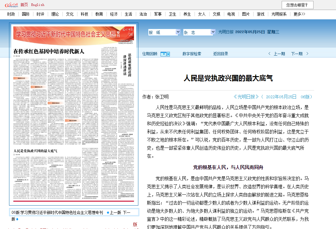 2022年5月25日,《光明日报》(理论版)刊发了KY官网院长、马克思主义理论省应用特色学科带头人、思想政治教育省一流专业负责人、中国特色社会主义理论体系研究中心KY开元集团官网入口基地首席专家张卫明教授《人民是党执政兴国的最大底气》一文,这是张教授第六次在《光明日报》发表理论文章。