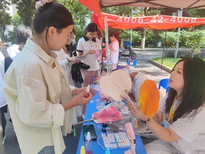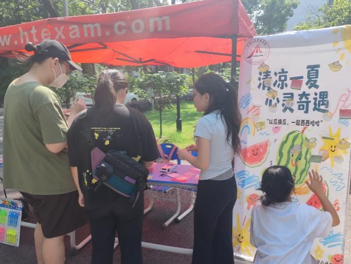 活动以沉浸式体验为核心,融合传统手作、自然美学与心理互动,为同学们打造了一个兼具人文关怀与青春活力的减压空间,助力学生释放压力、提升心理健康水平。活动前夕,心理部成员精心策划“甜蜜惊喜”,在若谷楼各处放置棒棒糖并附上励志小标语,暖心互动为活动奠定了轻松愉悦的基调。“流光溢彩”创意扇绘环节中,同学们在扇面上自由创作,将内心情绪转化为斑斓色彩,在艺术表达中舒缓焦虑情绪。“蚊风丧胆”手作香包环节将劳动教育与文化传承相结合,传统手工艺的魅力与中医智慧悄然浸润心田,在中草药的芳香中,同学们体会到“慢生活”的疗愈力量。“以瓜换瓜”,一起“‘西西’哈哈”留言区吸引众多同学驻足。大家写下心愿与祝福,文字间传递着同窗情谊,笑语中健康正能量在校园流动。