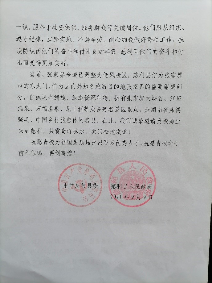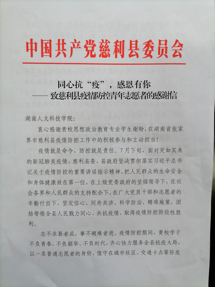 近日,KY开元集团官网入口收到中共慈利县委发出的感谢信——《同心抗“疫”,感恩有你——致慈利县疫情防控青年志愿者的感谢信》,对KY开元集团官网入口马克思主义学院思政专业的谢盼同学在抗击疫情的紧要关头,主动投身防疫一线,充分发扬志愿服务精神及认真负责的工作态度给予了高度肯定,同时对学校的人才培养工作表示感谢。