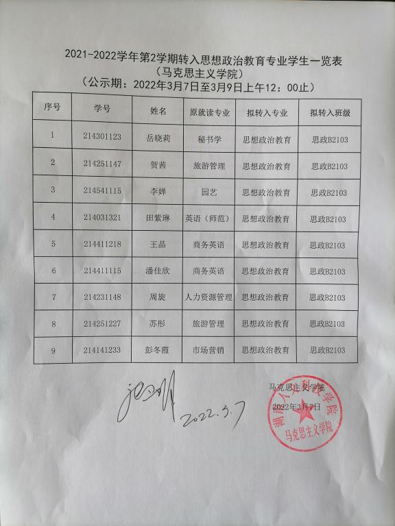 2021-2022学年第2学期转入思想政治教育专业学生公示