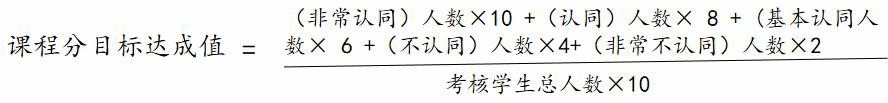 主要采用问卷调查法。设计调查问卷时,充分考虑评价对象的亲身体验和主观感受,紧扣课程目标的内涵设计问题,问题以量表形式设计,内容不重复、不交叉,问卷选项设计为非常认同、认同、基本认同、不认同和非常不认同五个层次,分别赋分为 10、8、6、4 和 2 分。课程目标达成情况的调查问卷在课程结束时,请初修某门课程的学生以单选形式独立填写完成。按课程目标逐条统计回答“非常认同”“认同”“基本认同”“不认同”和“非常不认同”的人数。采用下列计算方法获得各课程目标的达成情况: