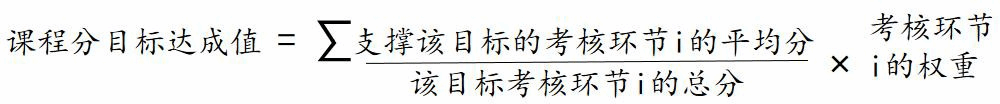 课程负责人或任课教师明确所评价课程的课程目标、支撑课程目标的考核环节及总分值和权重,采用下列计算方法获得各课程目标的达成情况: