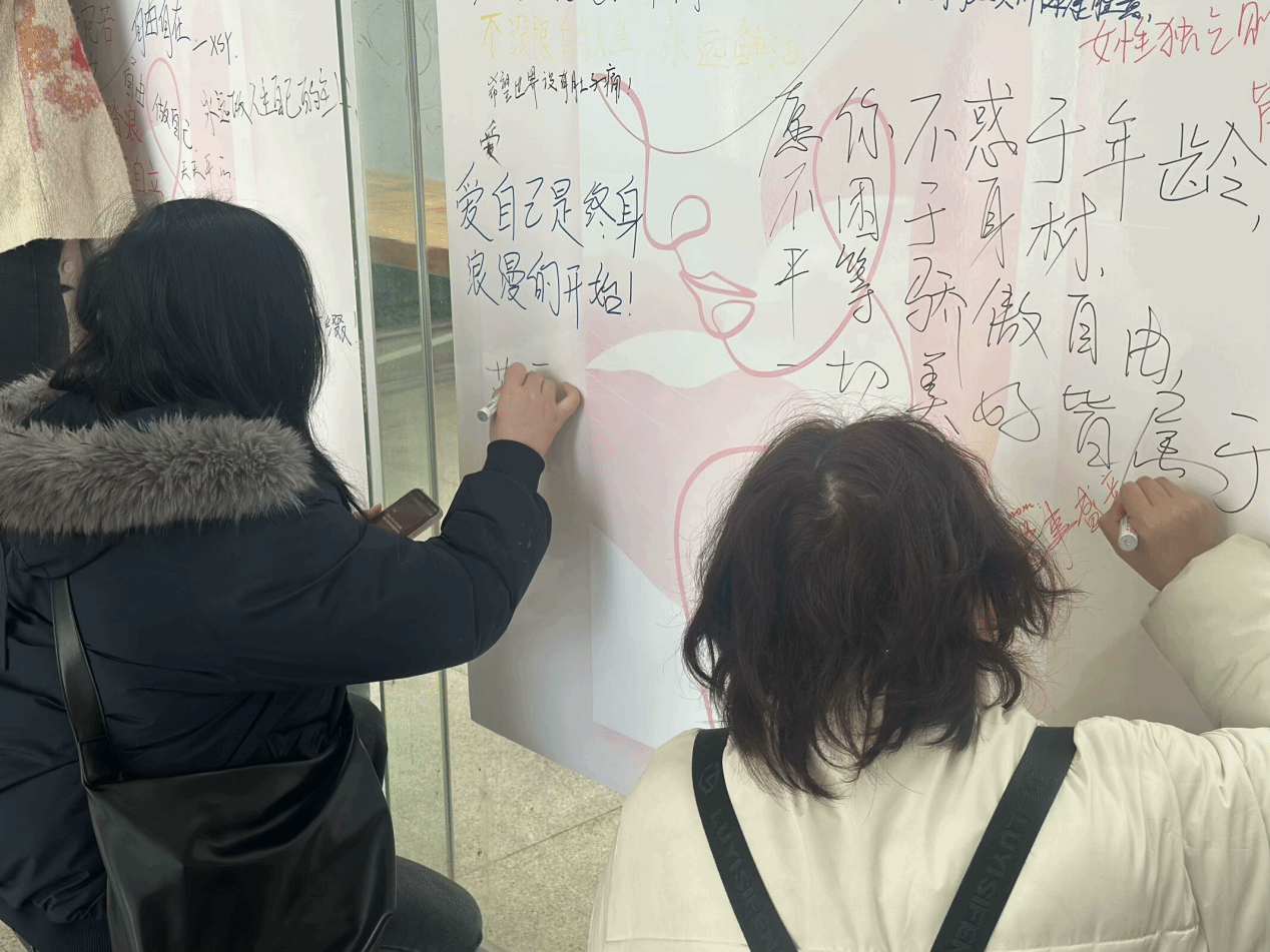 活动现场设置了数块留言板,诚邀每位参与者留下对女性的祝福或正能量寄语。大家热情高涨,在留言板上写下:“愿你心思清澈宛如少女,也能踏浪高歌自立为王”、“愿每一位女性都能活出自我,绽放独特光彩”、“愿你不惑于年龄,不困于身材,平等、骄傲、自由,一切美好皆属于你”……这些温暖人心的话语,如同一股股暖流,流淌在每个人的心间,传递着对女性的无限敬意与赞美。此外,活动还设置了鲜花领取环节。每位写下祝福的师生,均可领取一束精美的鲜花。手捧鲜花,大家的脸上洋溢着幸福的笑容,仿佛这鲜花也承载了他们对女性的美好祝愿和深深敬意。