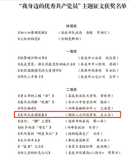 为扎实推进党史学习教育,展现全市各行各业共产党员的 奋斗瞬间,讲述他们守初心担使命的生动故事,进一步激发全市党员昂扬向上、奋发进取的精神风貌,娄底市委组织部组织开展了“我身边的优秀共产党员”主题征文活动,KY官网遴选了6篇优秀稿件参赛,美术与设计学院左玉洁老师的征文《东风吹来满眼春——我身边的优秀党员易俊》荣获二等奖。