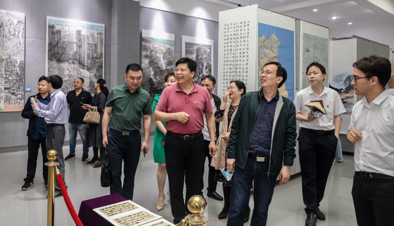 5月28号上午,校党委书记刘和云、校长刘铁铭、党委副书记李军林和在家的校领导在党政办、教务处和宣传部部门等主要负责人的陪同下,参观了美术与设计学院2021届毕业生作品展。正在学校指导廉政教育和纪检工作的省纪委驻教育厅纪检组副组长刘爱军一起参观展览。学院领导谢光绎、陆序彦、毛攀云、童玲、成伟以及各专业负责人、指导老师和学生一同参观毕业生作品展并做随行解说。