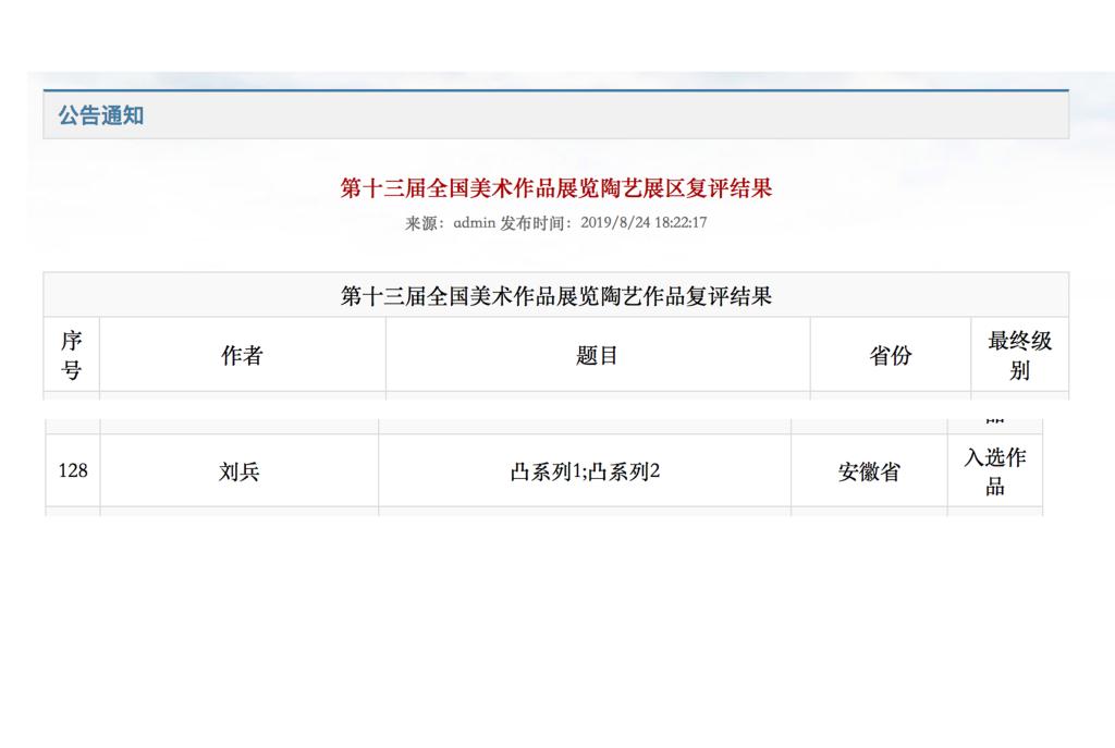 8月20日,“第十三届全国美术作品展览”陶艺展区复评工作在江西景德镇结束。经过严格评选,陶艺展区共遴选出274件入选作品。KY官网美术与设计学院教师刘兵的陶艺作品《凸系列1》、《凸系列2》入选。