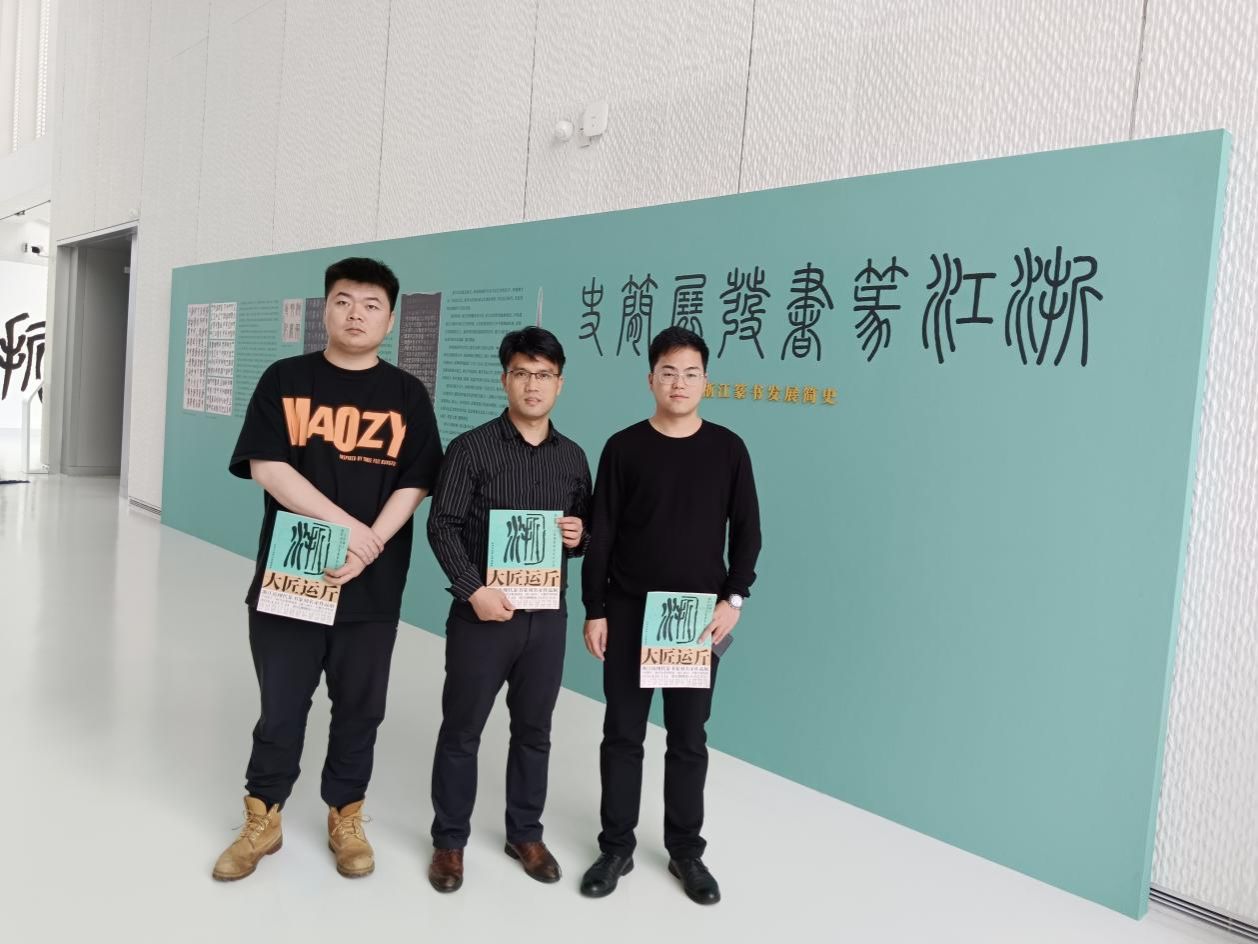 书法教研室主任蒋传存(中)与入展老师李国清(左)入展学生黄一航(右)在浙江绍兴特展现场