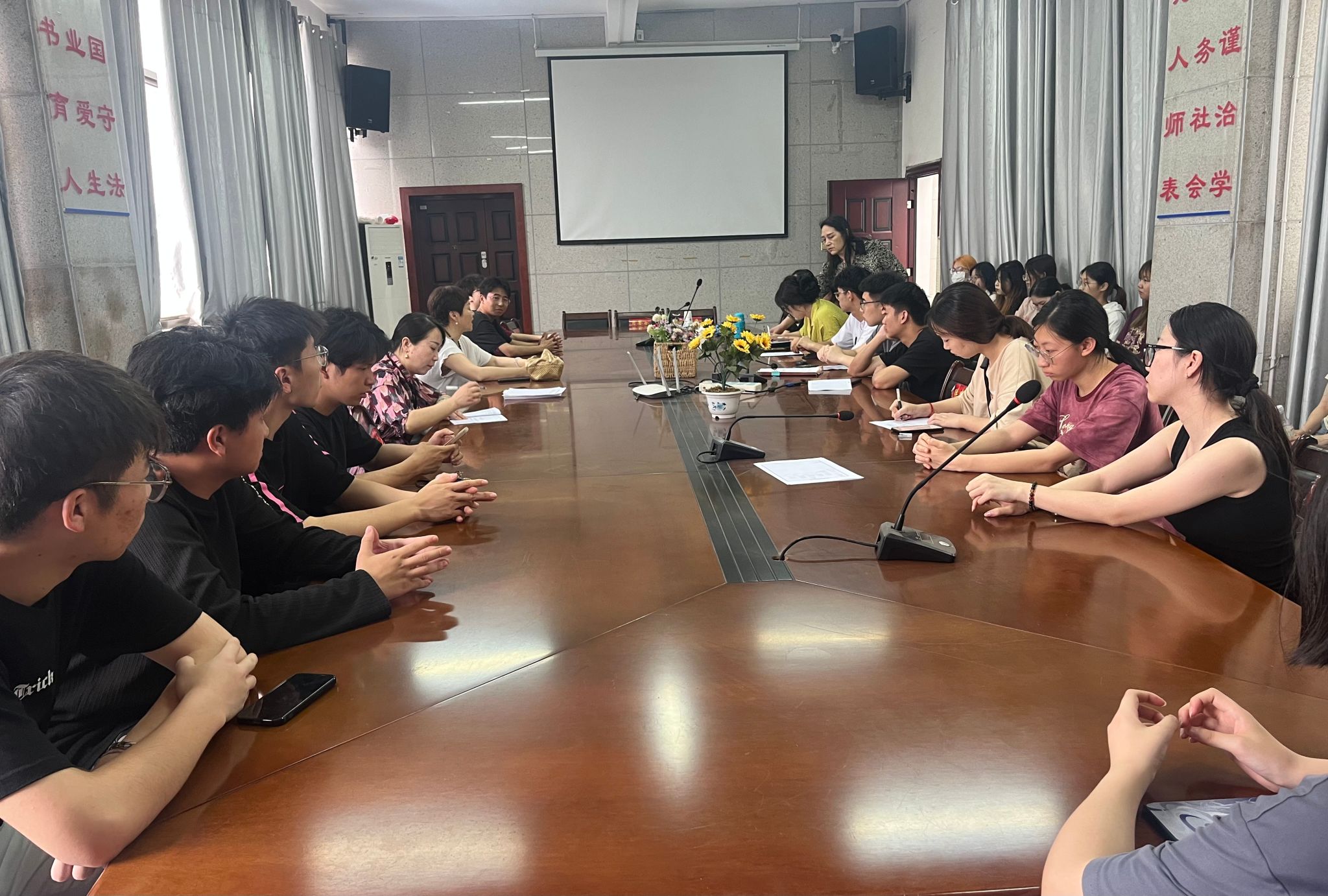 美术学专业于5月21日下午在216会议室召开了 2023-2024学年第二学期课堂教学学生座谈会。此次座谈会旨在全面了解教学工作运行情况,深化并稳步提高教学质量。贺平副院长、美术学教研室主任彭波、教务秘书张艳老师及学生代表共计30余人参加。
