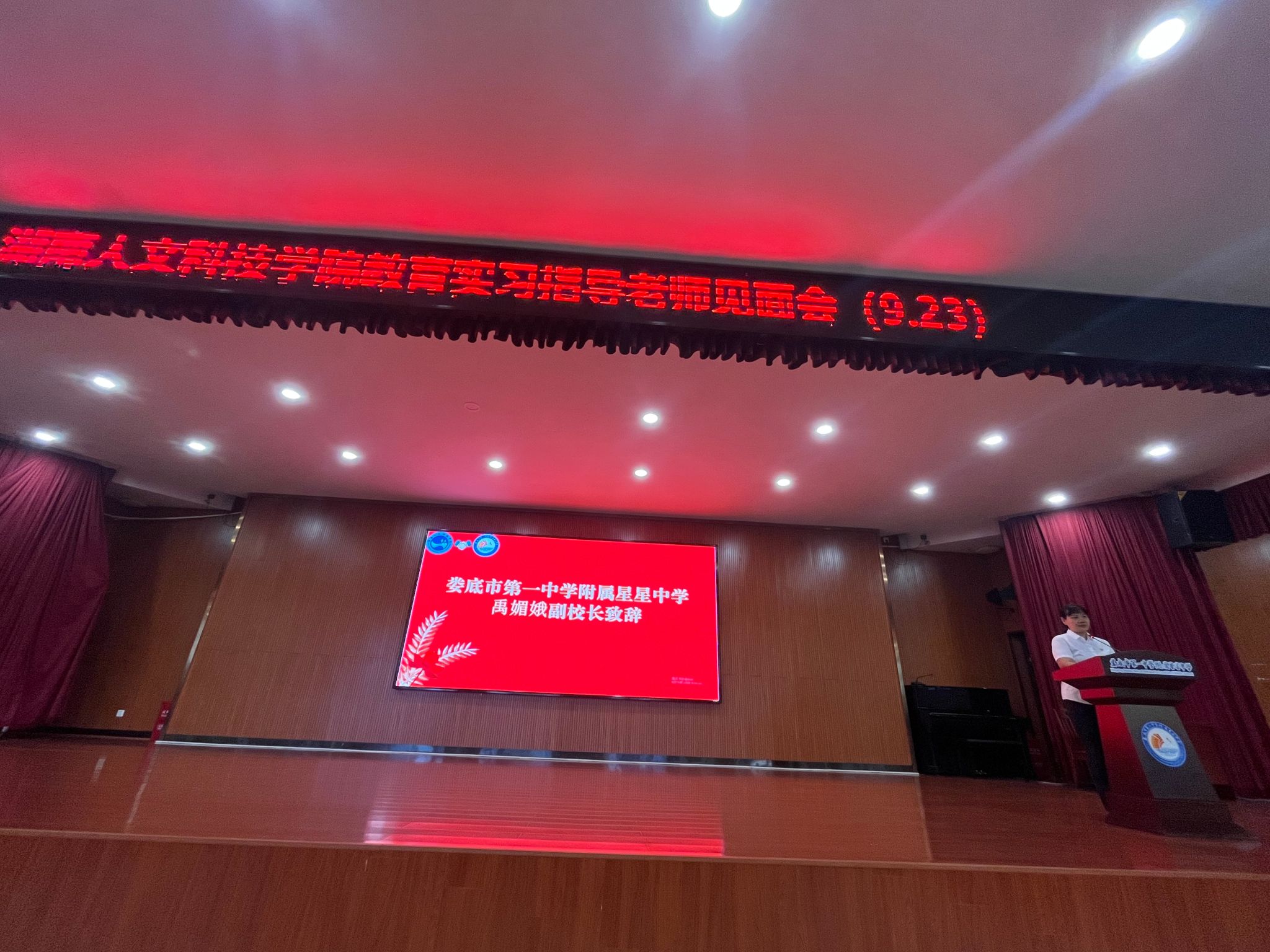 9月23日上午,娄底一中附属星星中学瑞星楼报告厅内,星星中学各级领导、KY官网实习指导老师、带队老师以及美术、中文、英语、体育专业的实习生们共同参加了一场简短而又热烈的实习生见面欢迎会。