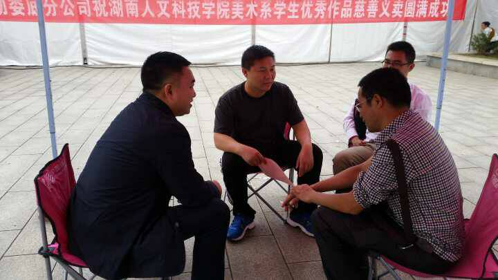 活动现场,党总支宣传委员彭建成与娄底市文体广新局产业办公室副主任胡锦辉就如何推进文化产业以及公益事业的发展进行了多方面的探讨。双方都表示,活动结束后,会分别向美术系、娄底市文体广新局的领导汇报,争取两个单位今后能继续密切合作,为社会公益事业贡献力量。(苏肖娟 彭建成)