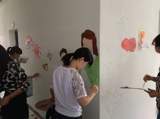从4月13日到19日,设计学党支部的党员同志和设计学的入党积极分子利用课余和周末时间轮流去画手绘墙,手绘范围大,从5楼到9楼,面积多达300余平方米,但支部党员和入党积极分子不怕脏、不怕累,历时7天,服务团队精心完成了墙绘任务。向平男特殊培训中心的聋哑儿童们献上了一份特殊的爱心“礼品”。