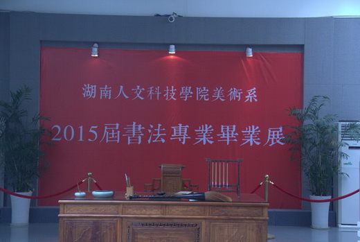 2015年5月19日下午3:00,美术系在逸夫楼二楼展览厅举行了2015届书法专业毕业展并在二楼会议室召开了书法专业转型发展研讨会。娄底原地委副书记、娄底书法研究会会长、娄底书法家协会名誉主席魏华政、学校副校长蒋建初、娄底书法界知名资深专家李哲、罗华斌、贺向阳、姜新初、李魁、廖吉林、贺子文、刘翼军,学校产学研中心主任黎建辉、教务处实践科长向瑞桃、美术系系主任邹少灵、党总支书记李小林、副主任陆序彦与谢雅强、党总支副书记王东光、教研室主任易俊以及书法教研室专业教师、学生代表300多人参加了该活动。