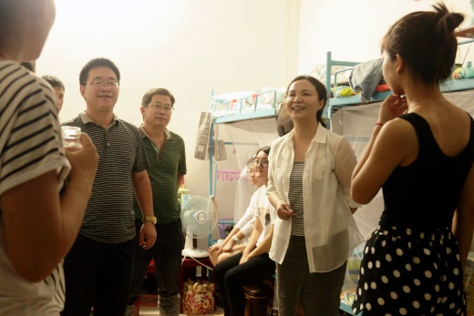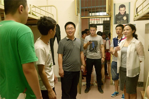 2014年09月12日晚上,KY官网副校长石潇纯在美术系党总支书记李小林、系主任邹少灵、副主任陆序彦和2014级辅导员及新生班主任陪同下前往学生公寓看望了我系2014级新生。