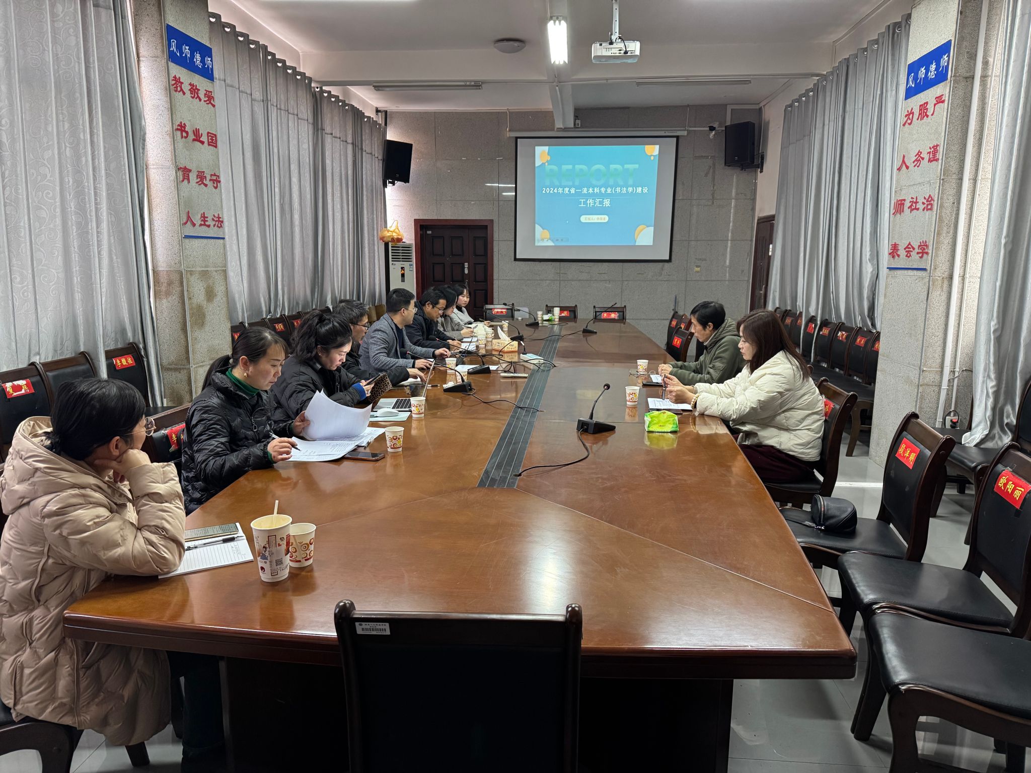 1月3日下午3点整,在美设院216会议室举行书法学专业省级一流本科建设成果汇报,院长陆序彦、副院长童玲、教研室主任和书法学教研室老师参加。首先书法学教研室主任李国清通过PPT的形式从专业建设情况、经费使用情况、存在问题分析、未来重点工作四个方面进行了汇报。在人才培养、师资队伍建设、教学资源优化、教师专业技能竞赛、学科竞赛以及学术研究与文化传承等方面亮点纷呈,专业建设方面书法学教研室老师们在2024年度取得了丰硕的成果,但是在省级教学成果奖、专著、教材等方面有所欠缺。