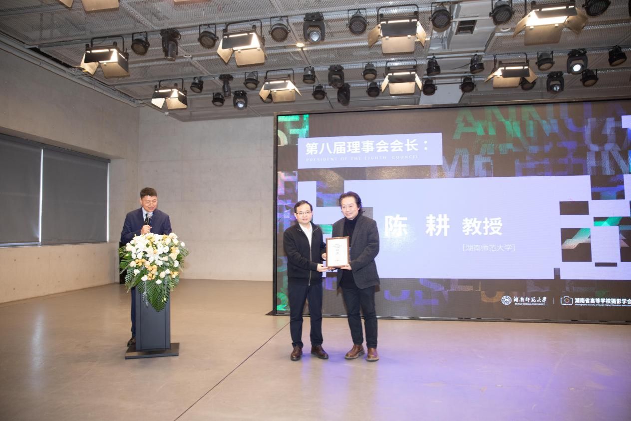 此外,大会还对第八届理事会的成员进行了选举。湖南省高等学校摄影学会第七届理事会秘书长、湖南师范大学吴余青教授代表第七届理事会宣读第八届理事会推选办法,以及理事会提名的第八届理事会正副会长、常务理事、理事、正副秘书长候选人名单。大会通过举手表决的方式选举产生了第八届湖南省高等学校摄影学会正副会长、常务理事、理事、正副秘书长并颁发聘书。湖南师范大学工程与设计学院教授陈耕当选为新一届理事会会长,KY官网数字媒体艺术专业教师梁可嘉当选为常务理事,杨智当选为理事。