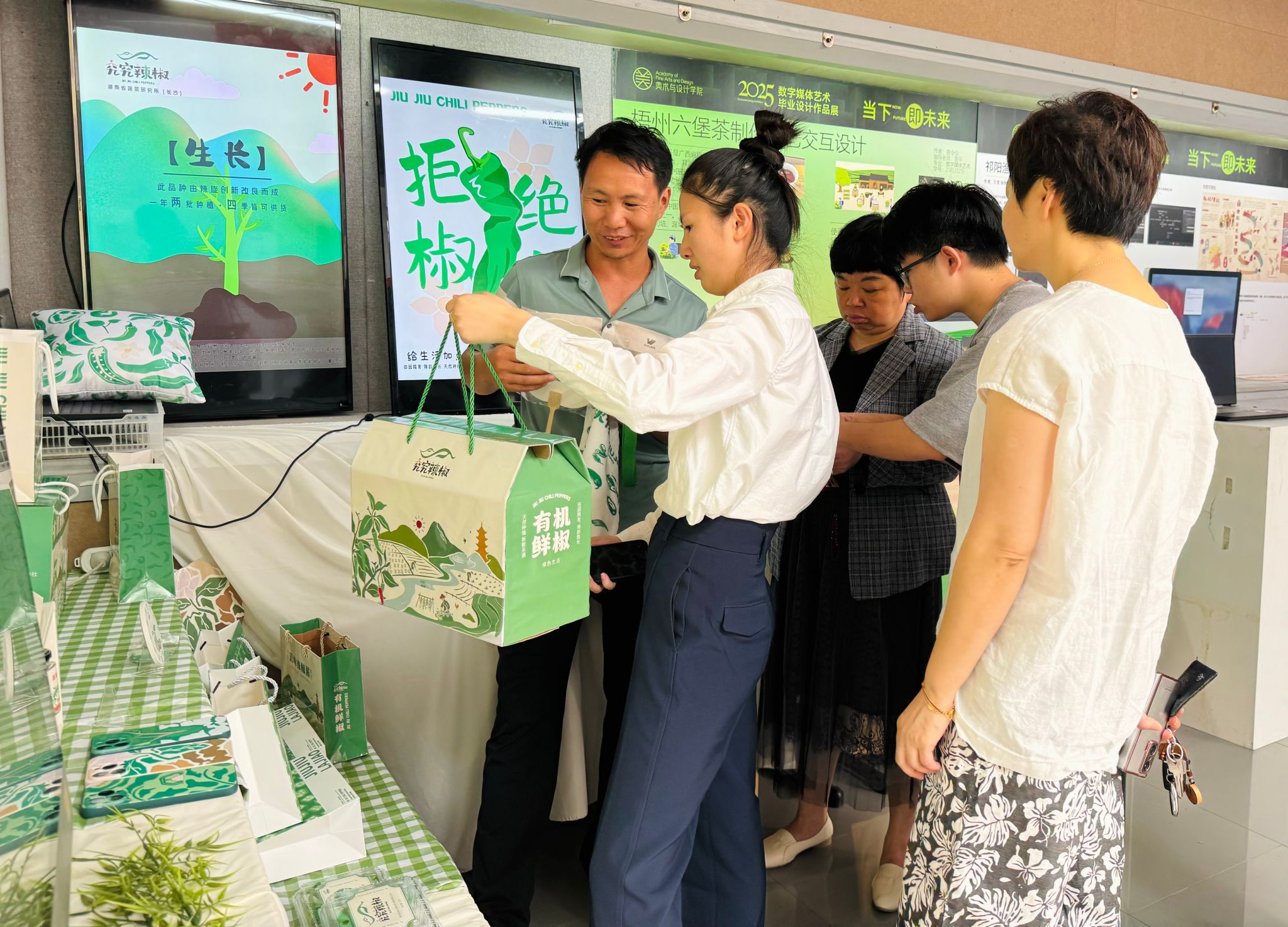 展览期间,美术与设计学院副院长贺平、数字媒体艺术专业主任梁可嘉全程陪同来宾参观。值得一提的是,洪山殿镇党委书记李姝与“究究辣椒”品牌负责人也专程赶来,他们饶有兴致地观看了学生为“究究辣椒”品牌定制开发的数字视觉产品。现场,李姝书记与品牌负责人和贺平副院长所负责项目团队达成战略合作意向,这一成果充分彰显了校地融合、产教协同育人的积极成效,为地方经济发展与人才培养搭建了良好的合作桥梁。
