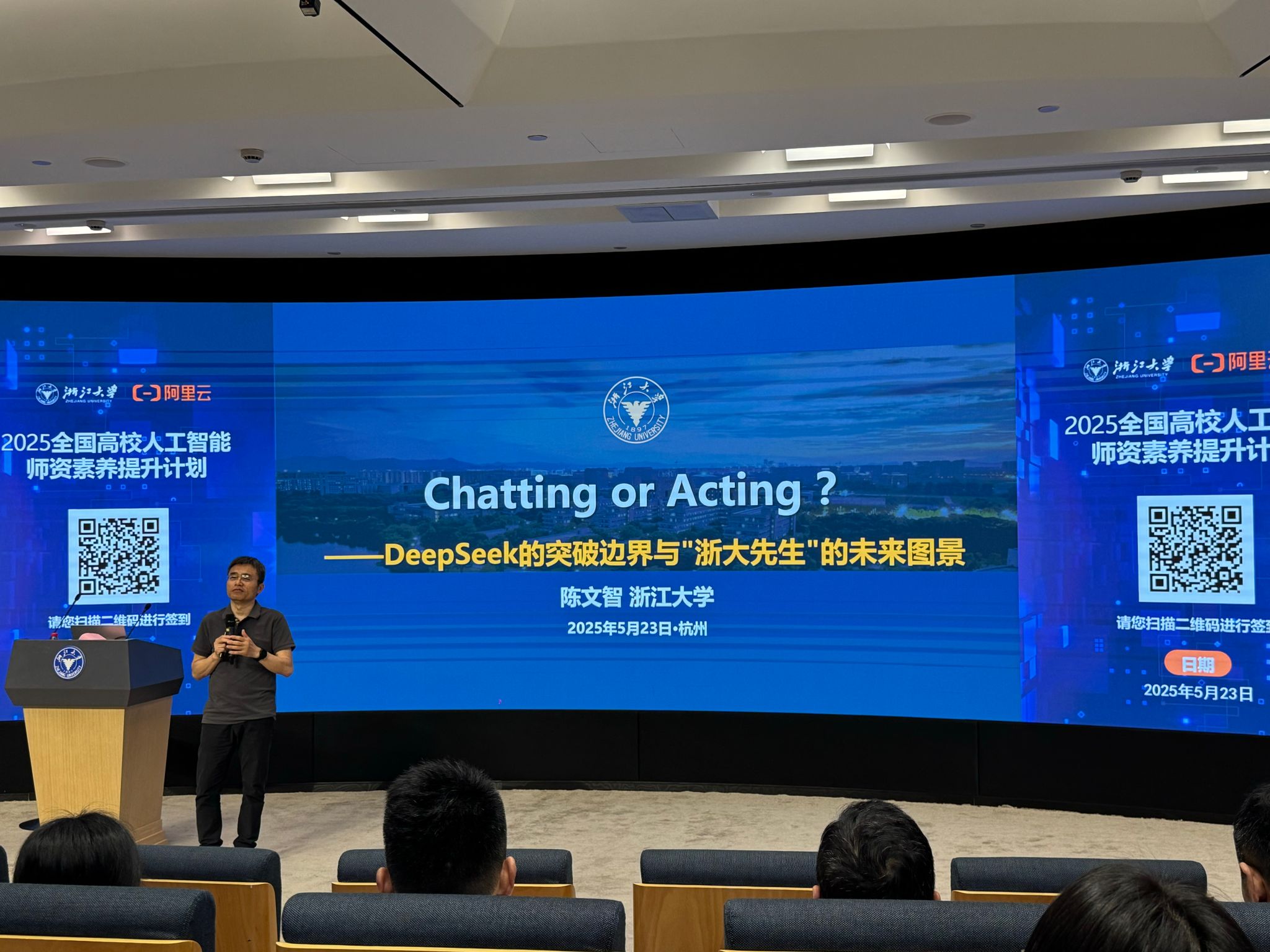 5月23日,活动在浙江大学紫金港校区拉开帷幕。浙江大学信息技术中心主任陈文智教授以《Chatting or Acting?DeepSeek的突破边界与“浙大先生”的未来图景》为题,深入剖析AIGC在教育与科研领域的应用潜力。阿里云设计中心总监王路平结合产业实践,分享AIGC技术驱动数字创意设计的落地案例与前景展望;下午专题研讨聚焦“AI赋能教师素养提升”:浙江大学教育学院副院长李艳、教育装备研究院院长施建国分别作《数智技术赋能教师发展》《生成式AI融入教育的实践路径》报告,为高校教师的能力提升与课堂创新提供了切实可行的思路。
