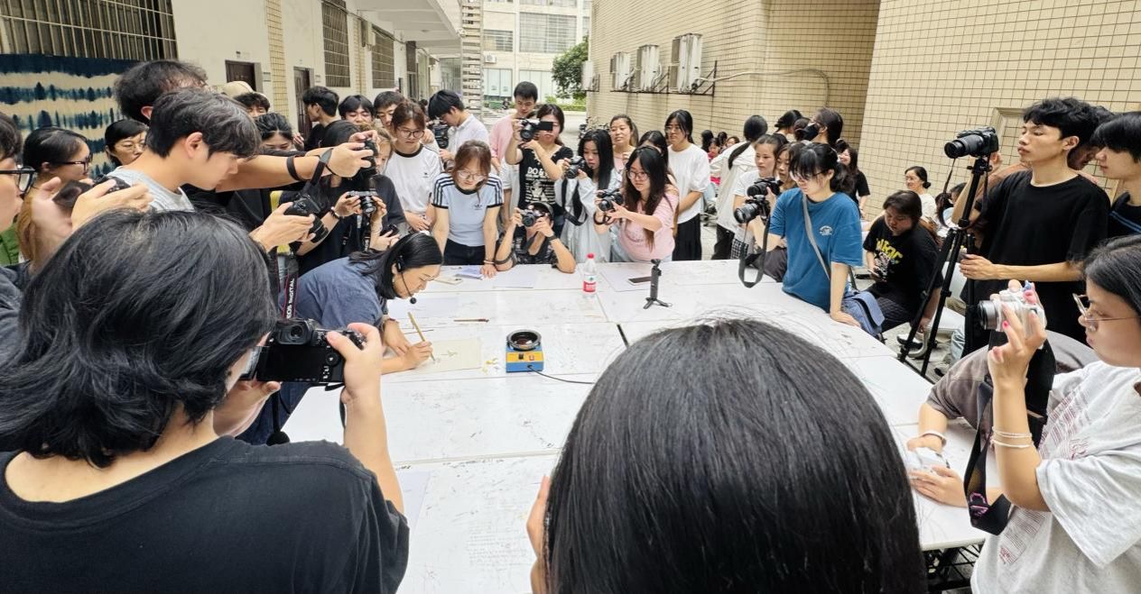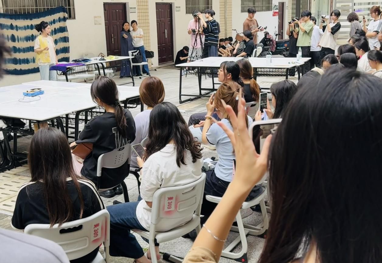 6月10日,实践教学环节在学院前坪开展,形成“传承人+双专业”协作链,活动由钟灵汐老师主持。书法专业的学生在扎染布料上即兴书写,墨韵随棉布吸水特性形成斑驳特效;数字媒体艺术专业的学生则细致观察、记录整个制作过程,以摄影与视频等方式呈现传统工艺的魅力与技艺之美,形成艺术与媒介的双向融合。邱玲老师现场指导示范扎染工艺,从折叠、扎结到染色、晾晒,手把手指导学生操作流程。她说:“扎染是‘束缚的艺术’,而年轻人用书法和镜头打破束缚,这正是非遗活态传承的精髓。”