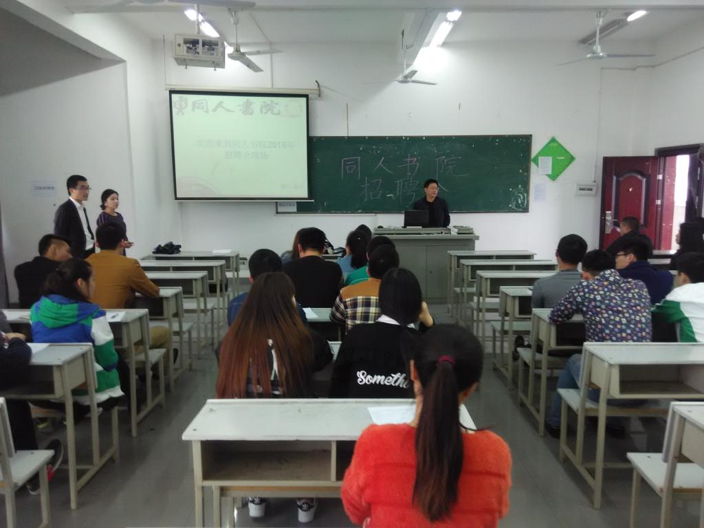 为进一步推进2016届毕业生的就业工作,4月12日下午,美术与设计学院在学校春季大型招聘会后,专门邀请同人书院来KY官网作专场招聘会,此次招聘会由我院就业领导小组负责组织,李小林书记、王东光副书记、书法专业曾庆勋老师、就业专干到现场主持招聘工作。李小林书记对此次招聘公司作了简单介绍,并对其来KY官网举行招聘会表示感谢。同人书院相关负责人对其书院的基本情况作了介绍,并对KY官网领导、老师的热情招待表示感谢。