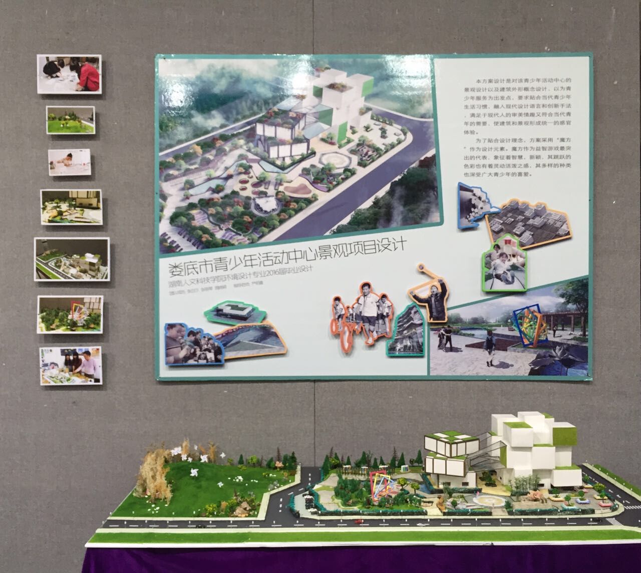 同学们以人文素养、综合知识、创新观念与专业技能,设计了实际项目或前沿虚拟项目,展示了师生对环境设计的艺术与科学、功能与智能、生态与可持续发展、设计与人性关怀等不同层面的探索诠释。代表作品有:梅山文化新农村建筑式样探究,娄底城市广场的商业街景观规划,人文科技学院文化街创意项目,校园文化景观小品改造,屋顶花园空间设计,御景湾售楼部设计,名族风情的土竹屋餐饮空间,现代品牌店面设计,“一树一屋”生态幼儿园设计,古朴书香的棋缘山庄,电影文化咖啡吧,乐开口面包店设计,“回爱”养老院设计等。