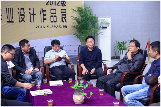5月27日上午,美术与设计学院环境设计专业2016届毕业设计展暨专业发展研讨会在逸夫楼展厅举行,周发明副校长参加座谈并发表重要讲话。教务处处长羊四清、科美集团总裁谭铁牛、景来园林有限公司总经理罗少华、星艺装饰集团娄底分公司总经理胡贵军以及美术与设计学院的领导参加了研讨会并提出了许多建设性的宝贵意见,美术与设计学院各专业负责人及环境设计专业教师参加了研讨会。