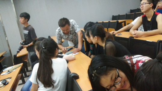随后,按彭建成老师的安排,我们以小组为单位开展实际雕刻操作,舒老师组织砚雕师傅给每组学生分发了砚石。胡中纲先生结合投影仪演示操作,从砚雕的图案的构成、基本布局以及刀法、刻法等工艺技术进行了讲解。之后胡中纲先生带领文田砚工艺雕刻有限公司的师傅们对学生进行手把手的辅导。