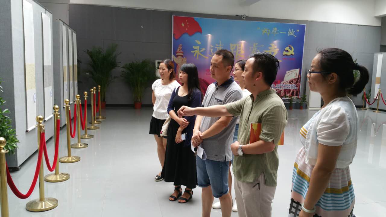 201671日,美术与设计学院党总支副书记王东光和环境设计系支部书记严明喜组织教师党员罗颖、谭意、李卫婷、李洁,在逸夫楼二楼展厅观看“永远跟党走楷书精品展。以此举行纪念中国共产党成立95周年主题教育活动。