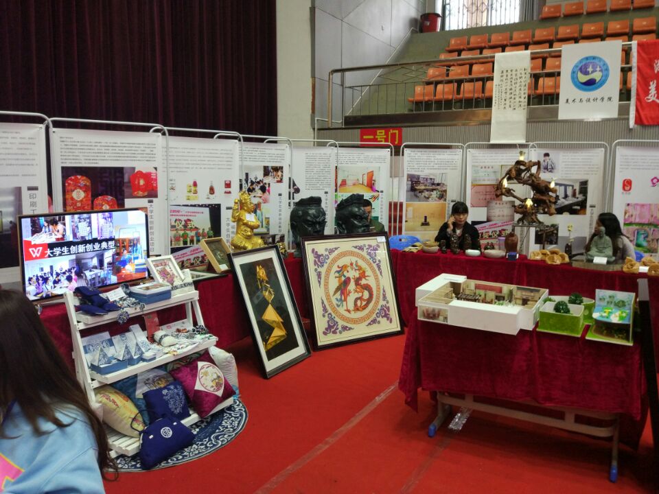 偌大的体育馆,摆满了各个院系丰硕的科技创新和创业成果,新颖、独特的展品让观展的同学们大饱眼福、大呼过瘾。美设学院展区琳琅满目的展品每年都最能吸引同学们的眼球,今年我们精选了陶艺、雕塑、布艺、建筑模型、版画等十余类作品进行了展出,种类丰富、数量庞大。同时,还按照创新创业基地、创新创业项目、创新创业导师、创新创业典型、创新创业比赛获奖等内容分类制作展出了三十余块展板。